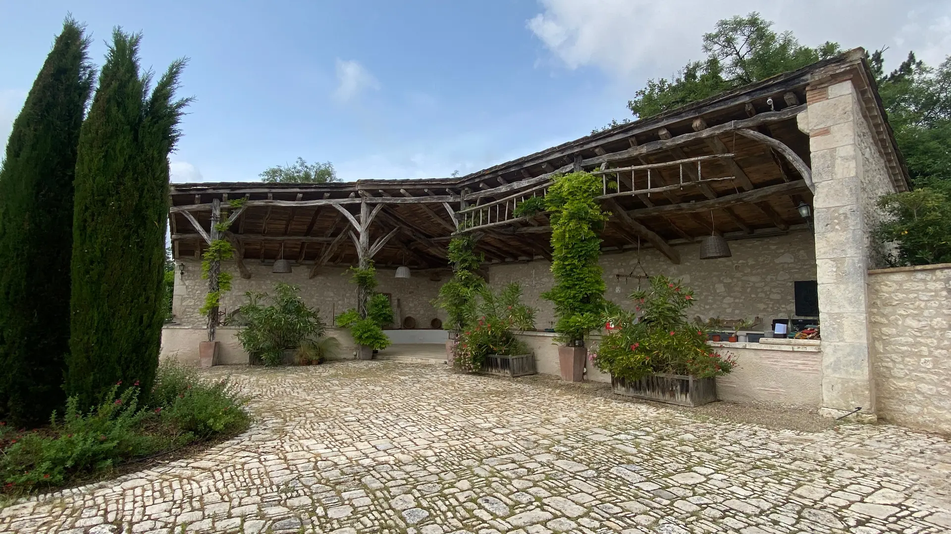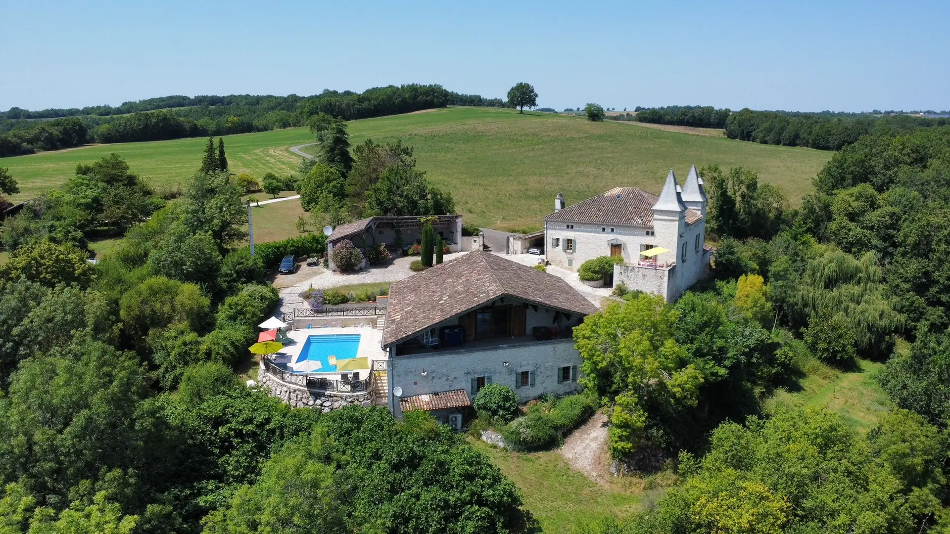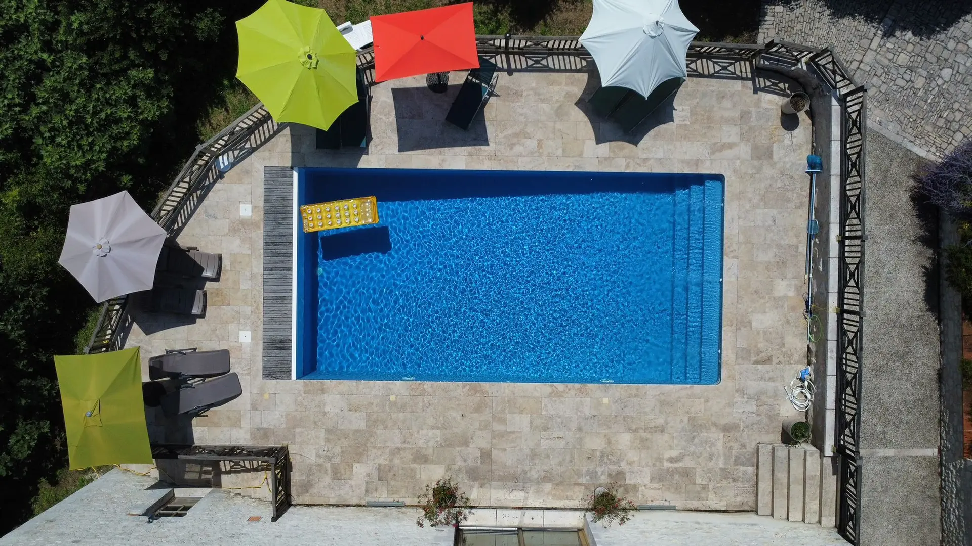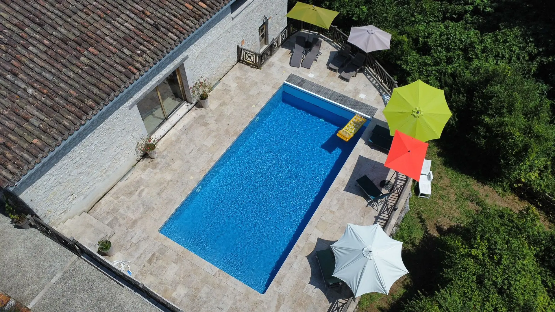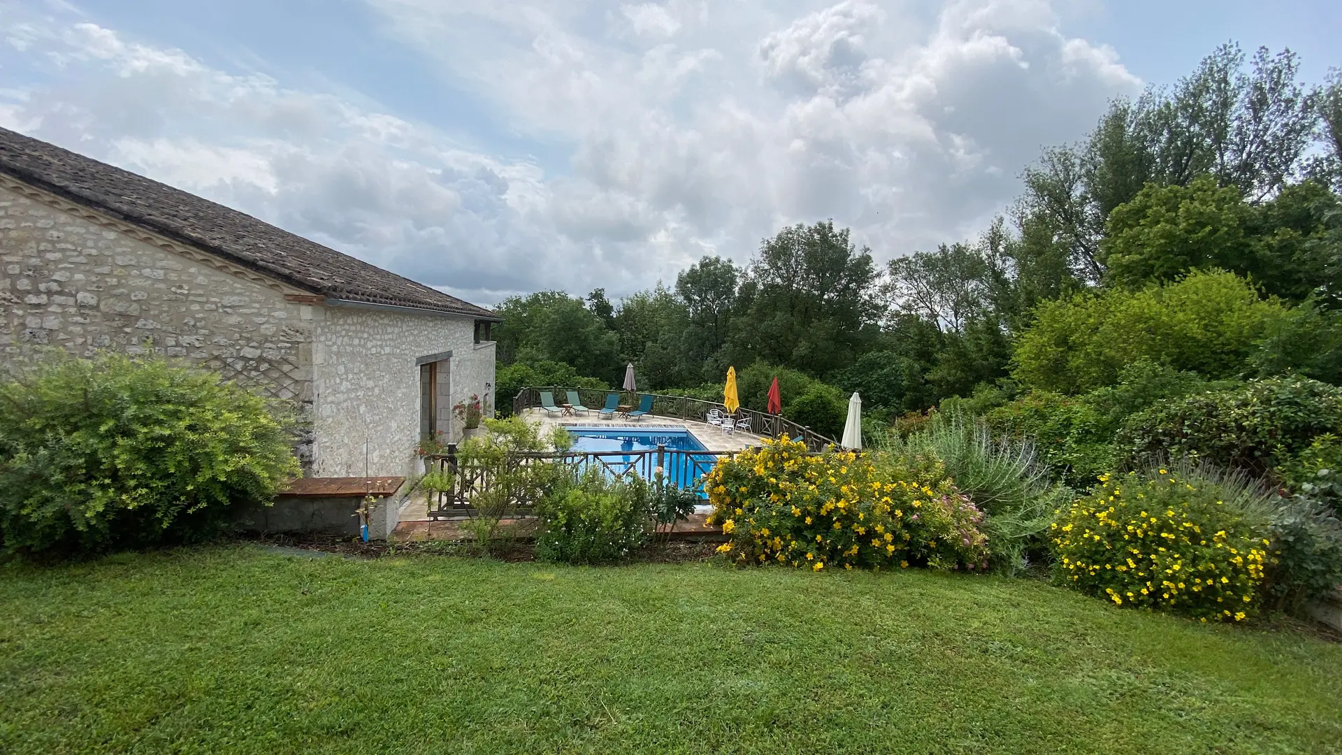 Lounge and summer kitchen with table, chairs and plancha. Private fenced swimming pool with alarm 10x5, maximum depth 1.80 m, which can be heated. Access from the pool to a toilet and shower room in the outbuilding. Pleasure garden. Paved courtyard. Wifi with fibre throughout the accommodation