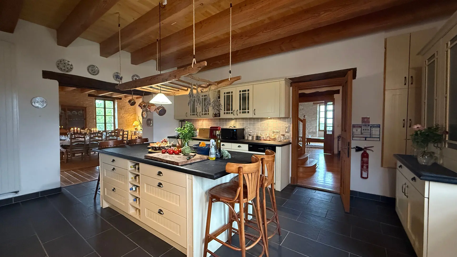 The house has 3 levels: on the ground floor, an entrance hall leads to a large hallway with a bedroom (1 x 160cm bed), a billiards room with a sofa, a utility room (washing machine, tumble dryer, sink) and 1 wc. On the 1st floor, an internal and external staircase leads to a beautiful hallway leading to a fully equipped kitchen (dishwasher, fridge, large worktop, hob), a dining room, a lounge (sofa, TV), 1 bedroom (1 x 160cm bed, 1 x 0.90cm bed) with its own bathroom and wc. On the 2nd floor, a large corridor leads to 2 bedrooms, each with 1 double bed (160cm) and 1 single bed (0.90cm) in one of the 2 bedrooms, each with en-suite shower room and wc. 1 bedroom with 1 double bed (160cm), 1 single bed (0.90cm) and en-suite shower room.