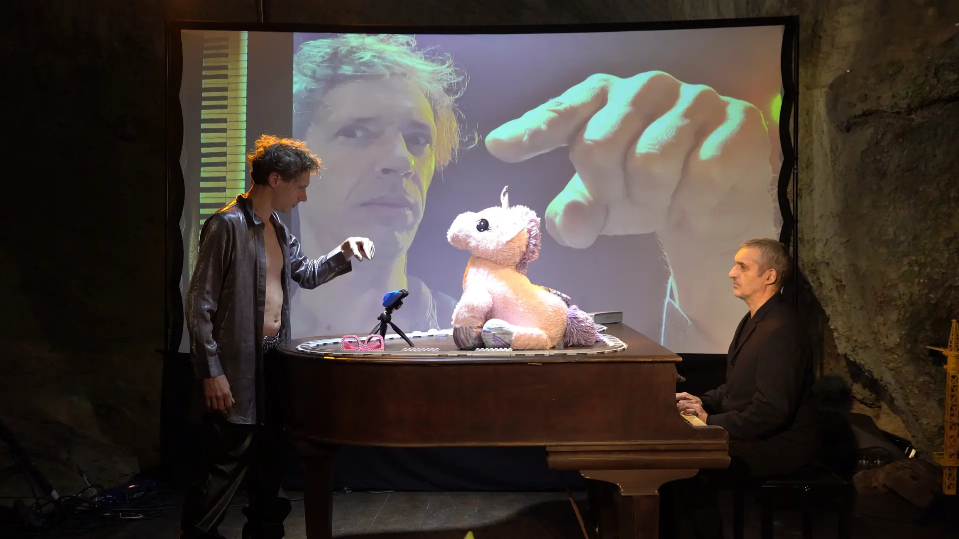 Until the radical gesture: a single word—STOP. The screen goes dark… The show continues without digital support. Just the piano, the voice, the objects. Reality reclaims its place. The wall falls.