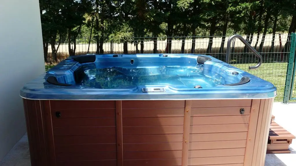 Swimming pool area (9mx4m-height 1.50m) fenced with garden furniture and deckchairs, jacuzzi for 6 people. Parking space.
