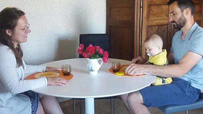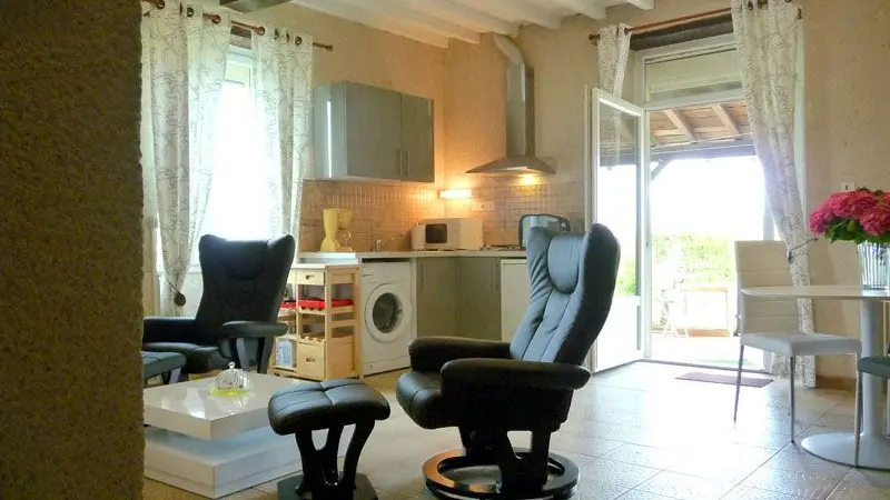 Accommodation comprises: living room with kitchenette (2 armchairs, MO, LL), 1 bedroom (1 double bed + 1 single bed + cot), shower room with walk-in shower and WC. Covered terrace with garden furniture and barbecue. Lawn area. Packed basket on arrival. High chair and cot available. The price includes: sheets, household linen and towels. Pet supplement: 30 Euros per pet/week. Optional extras: cleaning, extra bed, free wifi in the immediate vicinity of the owner's house. Enclosed grounds in front of and around the gîte.