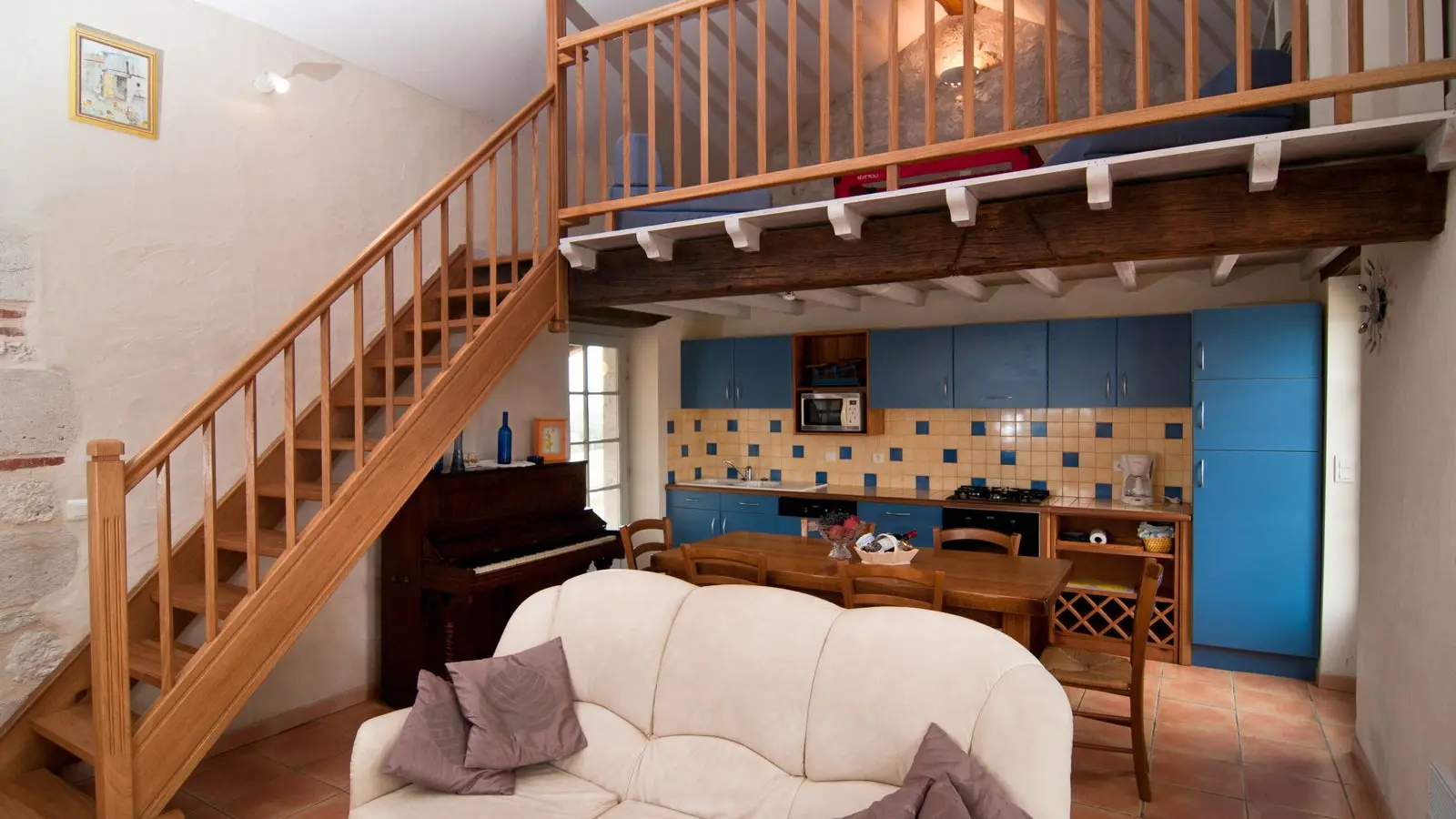Day room, lounge area, fitted kitchen (fitted with oven and hob, LV), mezzanine lounge area, shower room, WC. Communicating with the living room, the dovecote has 1 bedroom (1 double bed) on the ground floor. 1st floor: mezzanine bedroom (2 bunk beds 90cm). Laundry annexe. Terrace, garden furniture, barbecue. WIFI Optional: cleaning // bed linen. Swimming pool open from 01/06 to 30/09.
