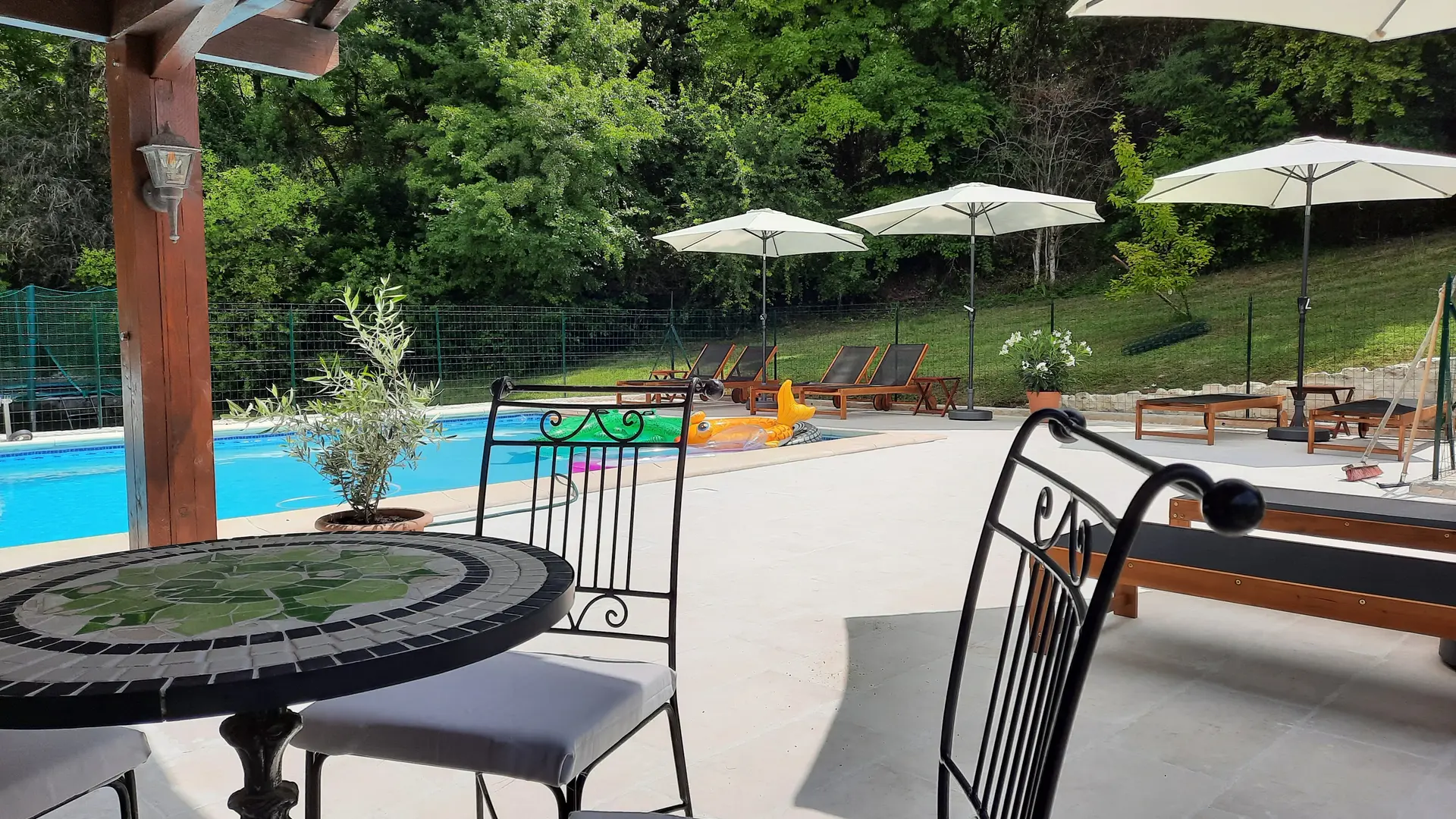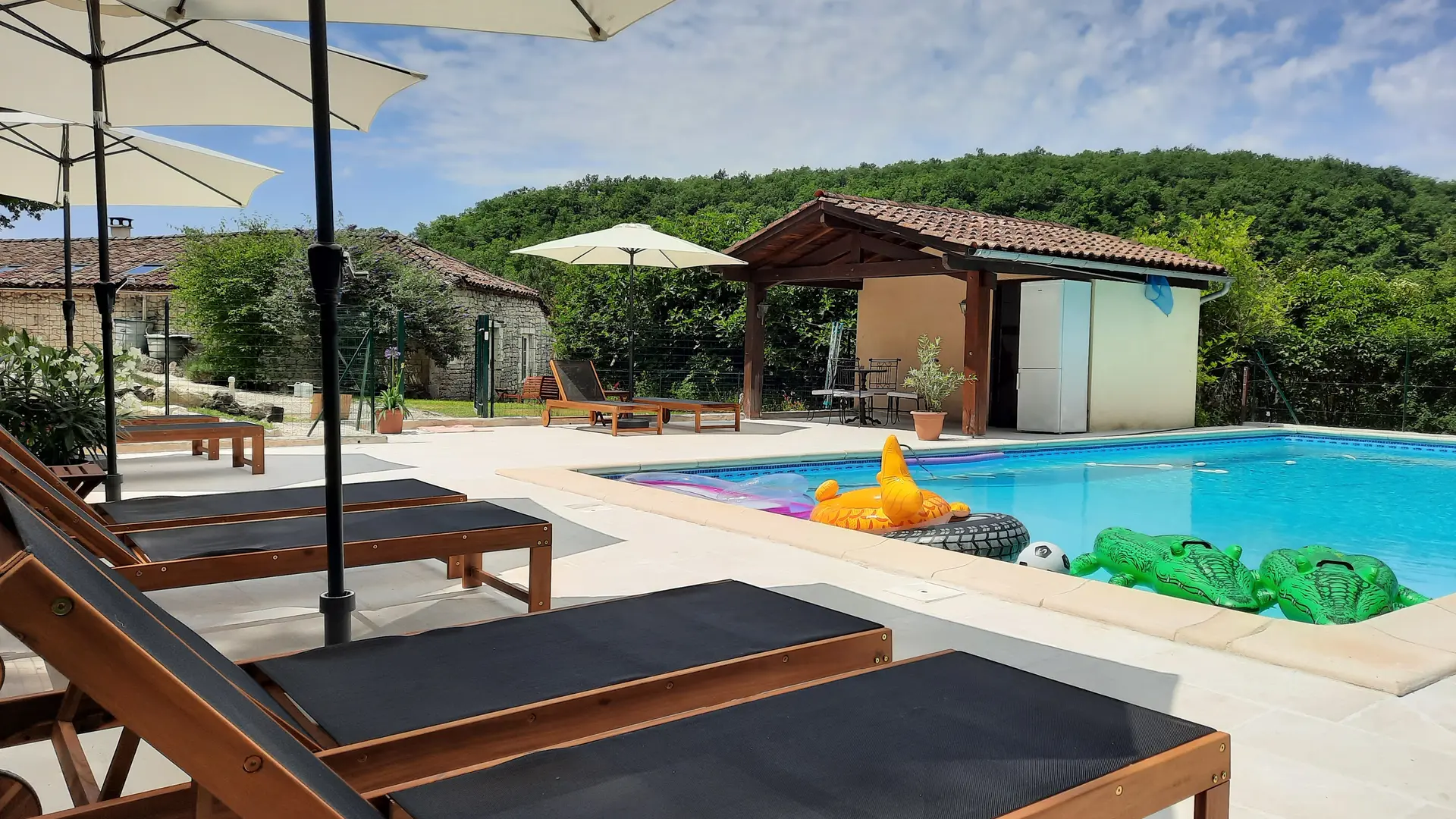 The gîte Le Tournesol is situated on the small estate of Touffailles, between the green hills and sunflower fields in the south of France. The estate consists of 3 holiday houses and the owners' house. It is particularly suitable for children. There is a beautiful heated swimming pool of 5x10 metres on site and many walking and cycling paths nearby. From the gîte you can walk to the lower village where there is a boulangerie.