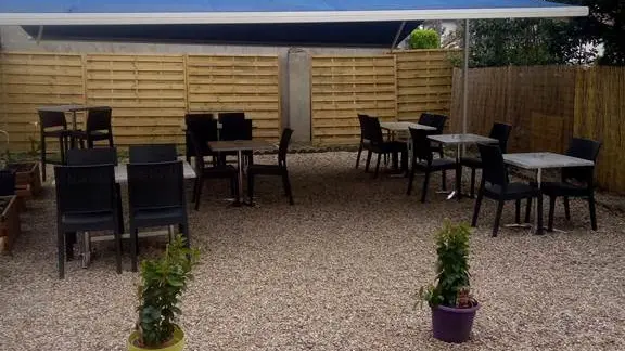 Large terrace with plenty of shade and flowers.
