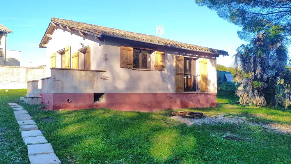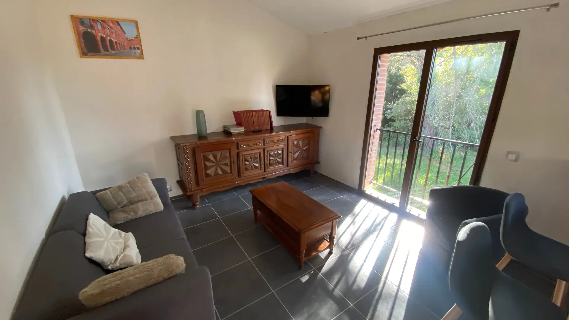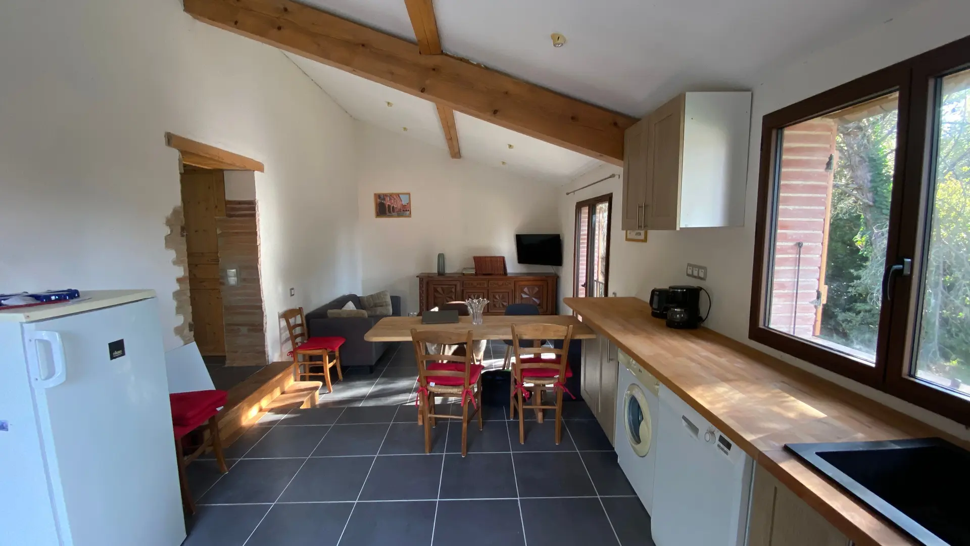 Access via the terrace to the living room with its kitchen area (fitted units with washing machine, dishwasher, fridge, induction hob, oven and small appliances, table with 3 chairs and 3 high stools. 1 step down to the lounge area with sofa, 1 armchair, TV and storage unit. 2 steps down to the sleeping area with 1 bedroom (1 double bed (160cm)) 1 bedroom (1 double bed (140cm)). Separate WC. Shower room with walk-in shower and washbasin. Terrace with barbecue and garden furniture. Large unfenced wooded plot. Bed linen and towels provided at extra cost.