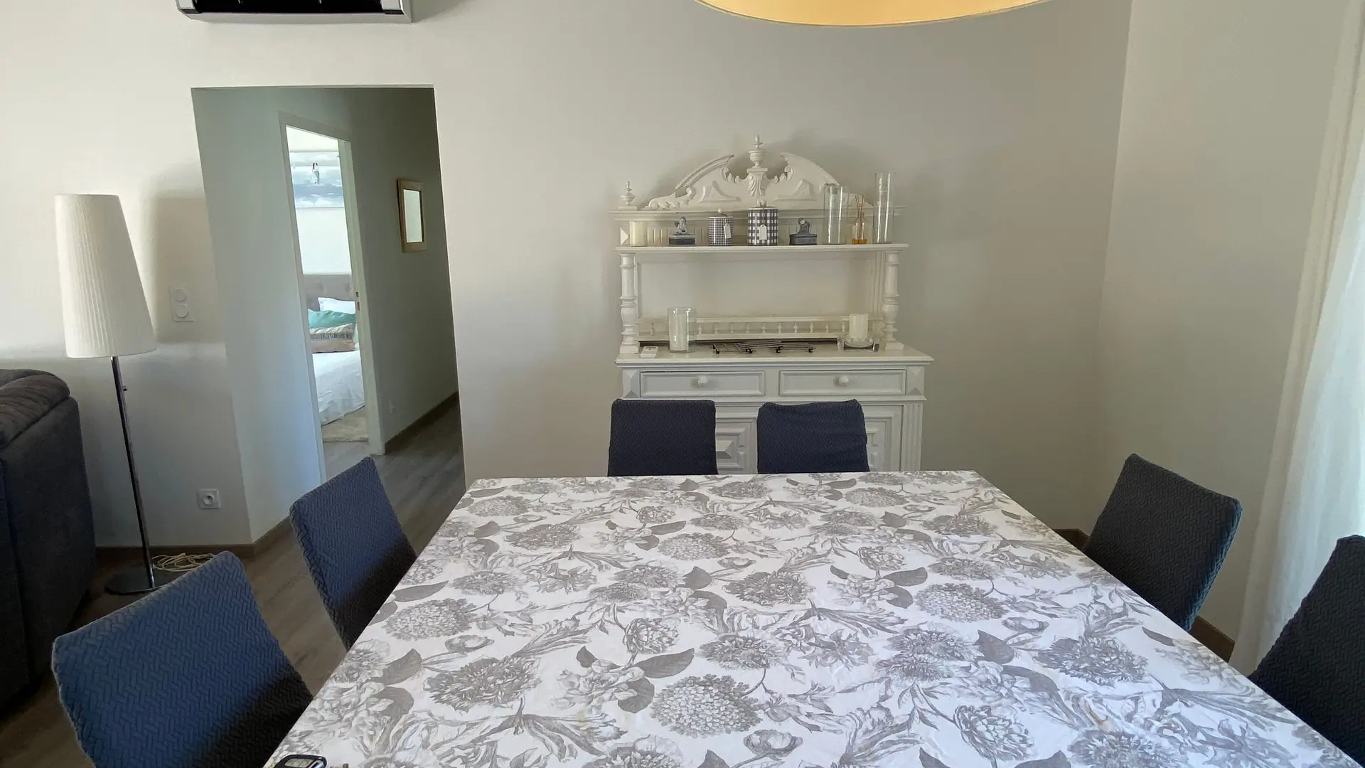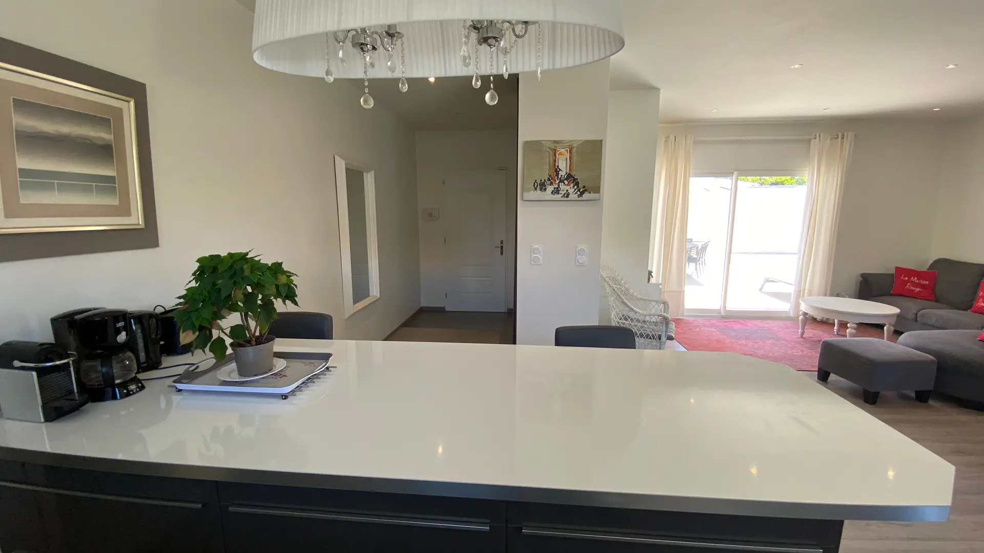 The house comprises : A large living room (corner sofa, flat-screen TV), fully equipped open-plan kitchen, dining area for 8 people.