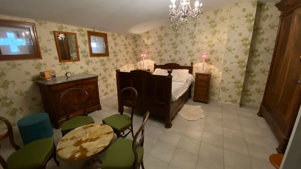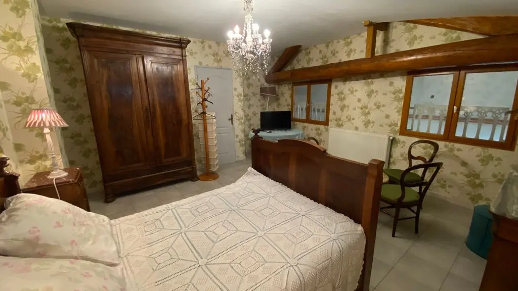 Ground floor: living room with dining area, sitting room and kitchen (gas cooker with hob and oven, washing machine, fridge, freezer), sitting area with sofa and armchairs. TV. Separate WC. 1st floor: bedroom with 1 double bed (140cm), TV. One bedroom with 1 single bed (0.90cm). Shared bathroom with bathtub. Separate WC. No wifi. Bed linen provided and included in the price. No bathroom linen. Outside area: large fenced garden with shared trees. Shared garden furniture and barbecue.