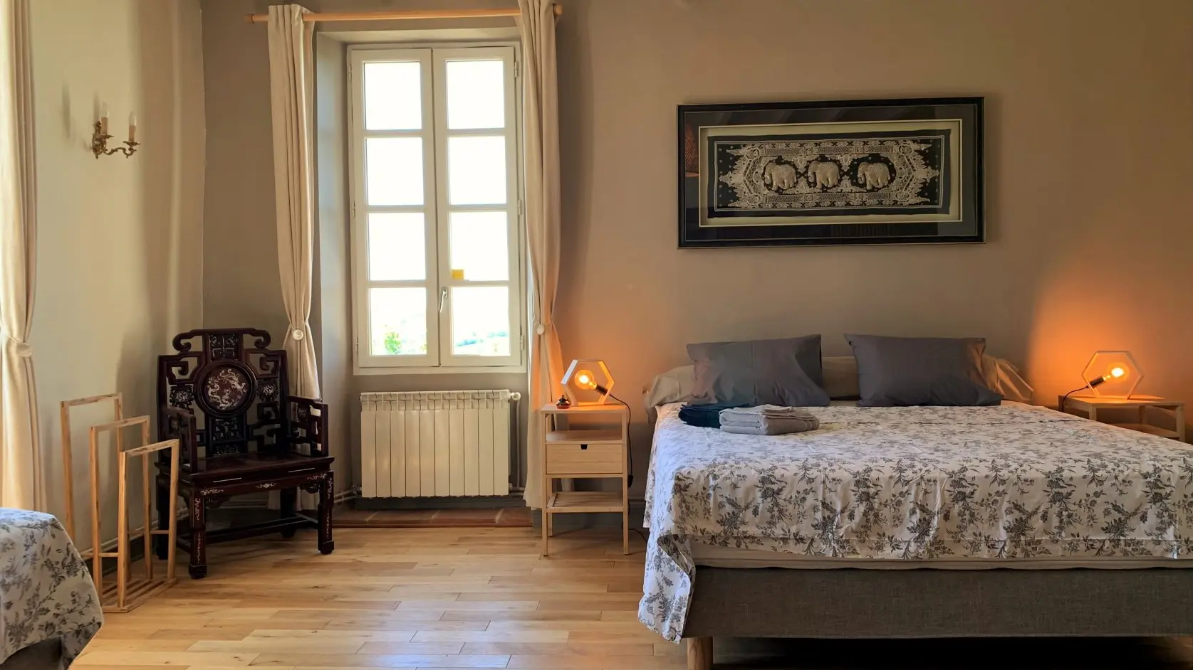All our rooms are very spacious and come with a private bathroom. Each room has its own unique character—sometimes marble, sometimes Indian or Burmese, or with undeniable old-world charm. Three of our rooms feature king-size beds, while the fourth has two single beds. Hearty breakfasts with homemade fresh bread are included.