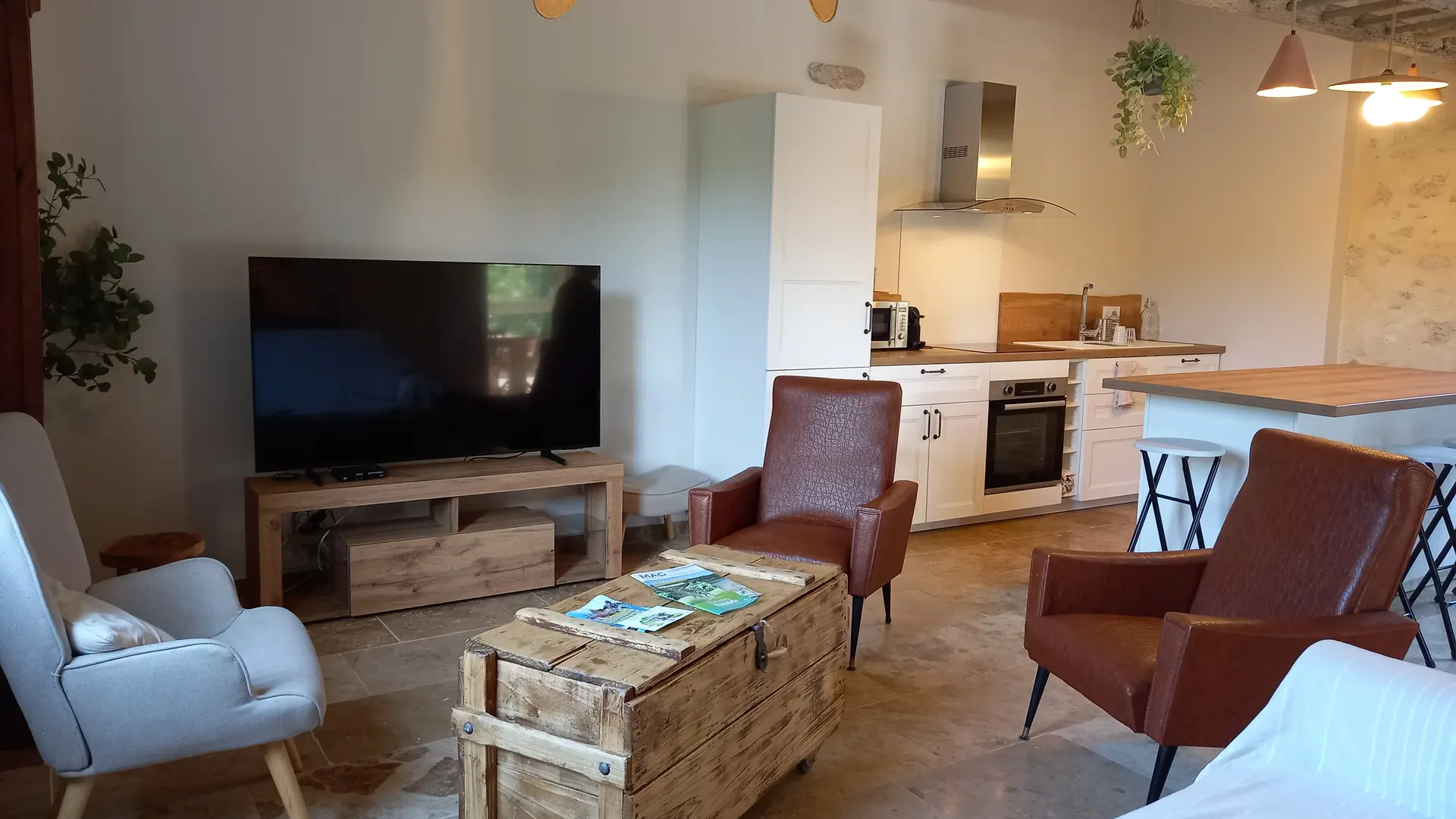 Upstairs, a spacious and bright living room awaits you, with a sitting area (convertible sofa 140x190, TV) and a fully equipped open kitchen. A spacious veranda can accommodate large gatherings, and a mezzanine has 2 trundle beds 90x200.