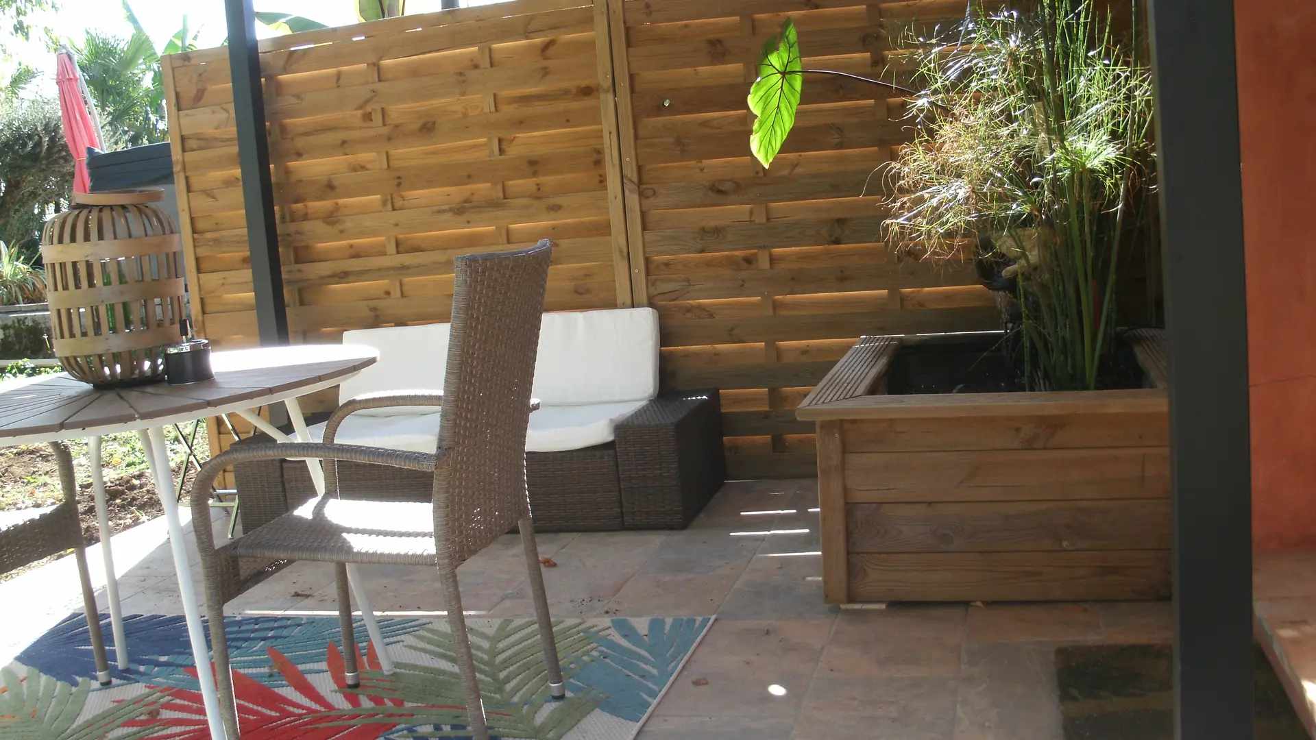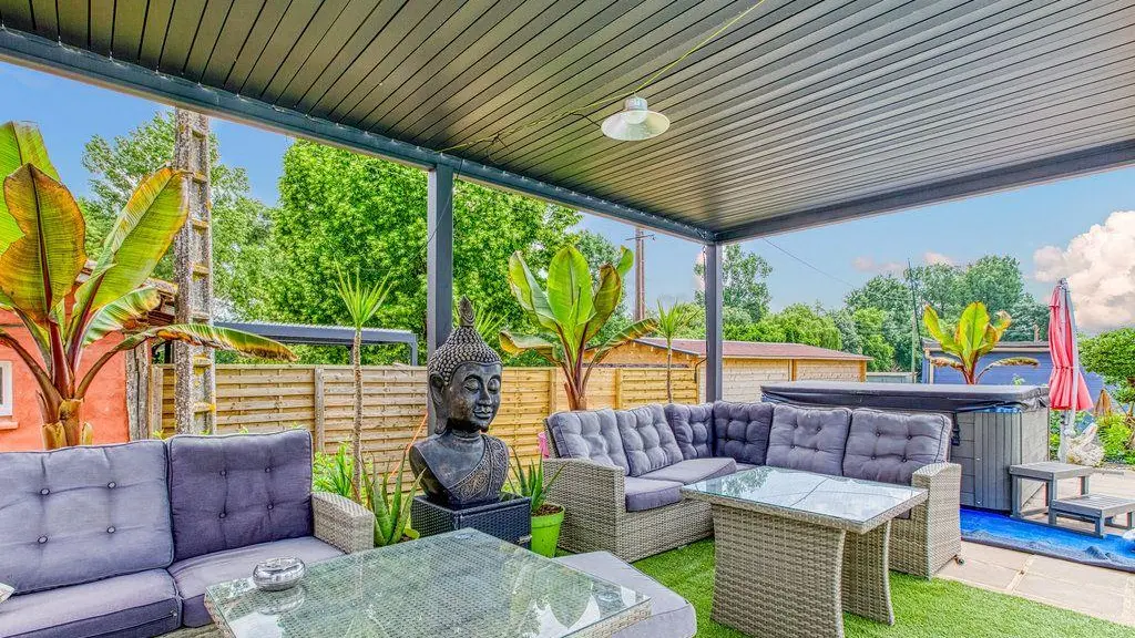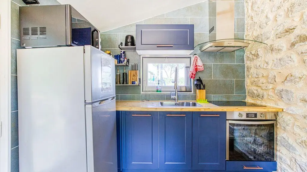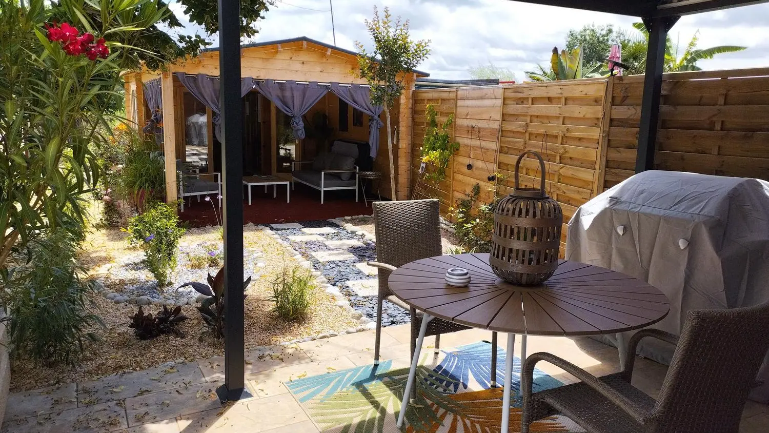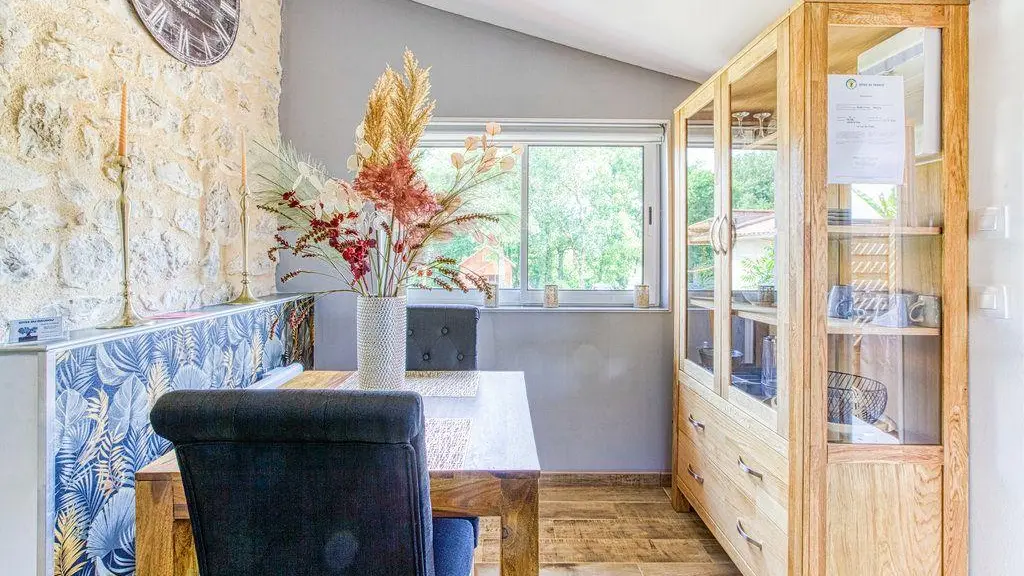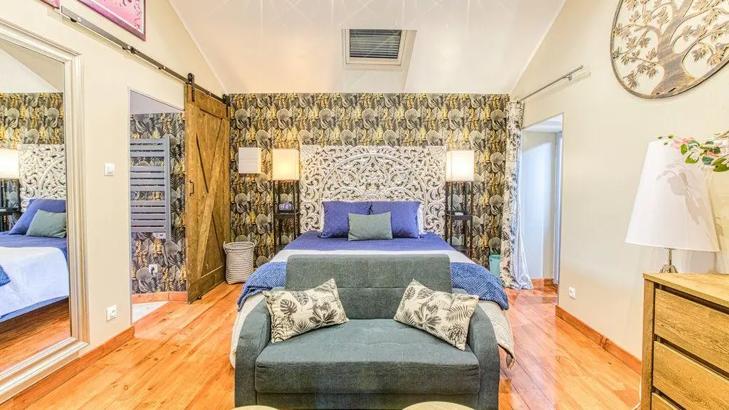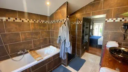 After a few steps from the car park, access to the terrace, garden furniture and pergola. One step leads up to the living area (fitted kitchen: fridge, freezer, hob, oven, microwave) with table and chairs. After 4 steps, the bedroom with 1 x 160 x 200 bed, sofa and TV. Bathroom with shower and bath, washing machine and tumble dryer. Bed linen and towels provided, included in the price. Free Wi-Fi in the accommodation. Essential oils for the Hammam. Bathrobes provided. From 1 May to 31 October, access to the shared swimming pool and spa.