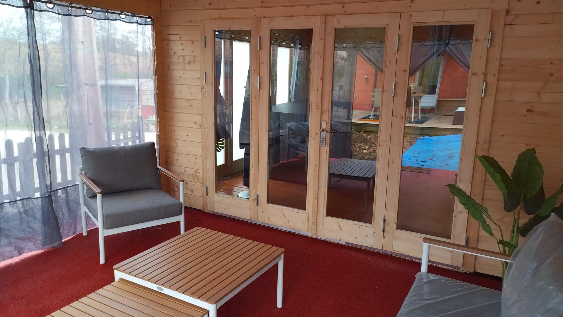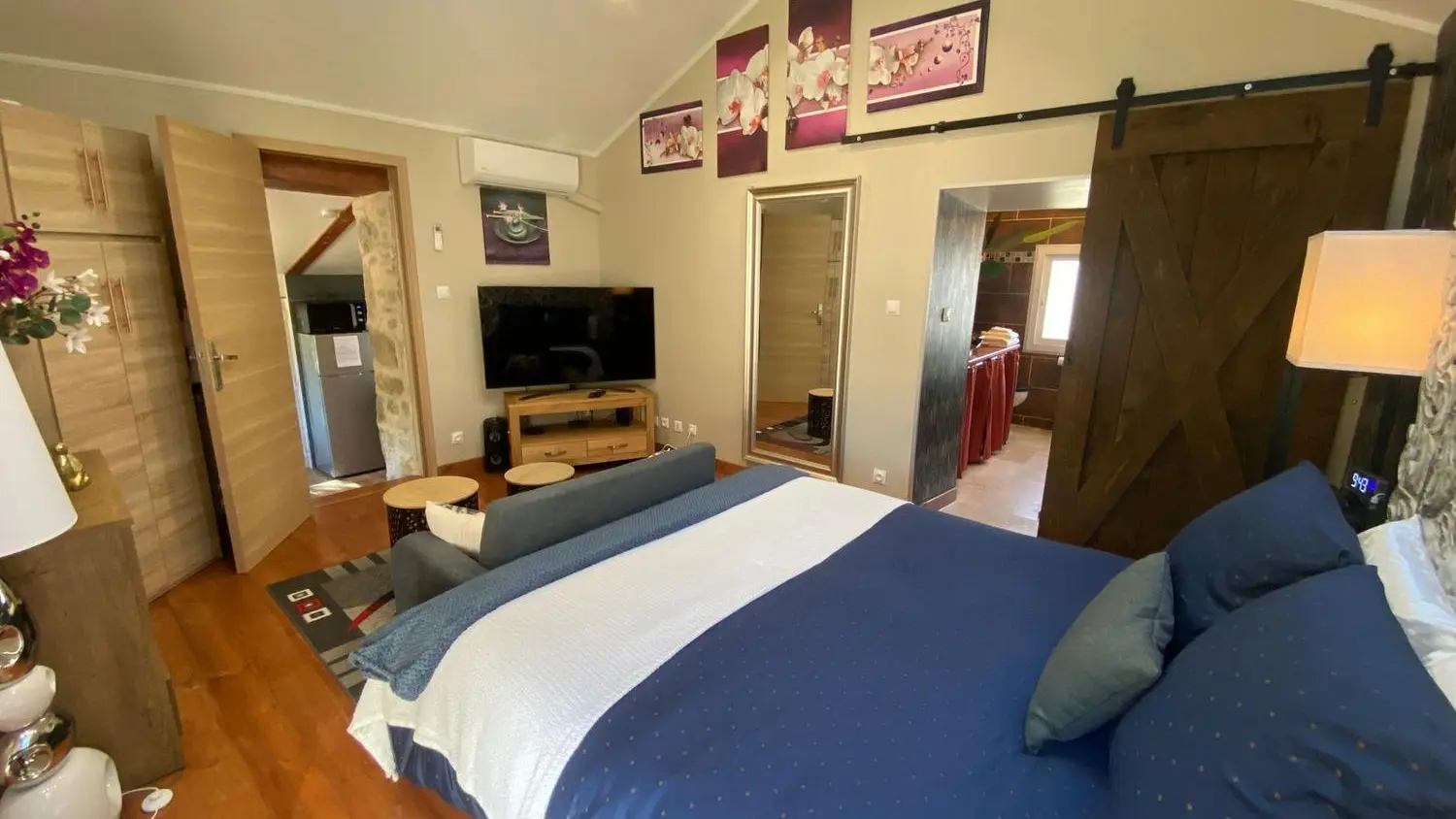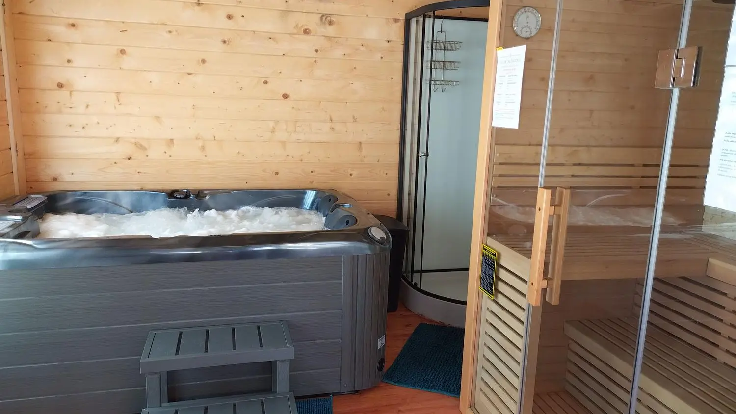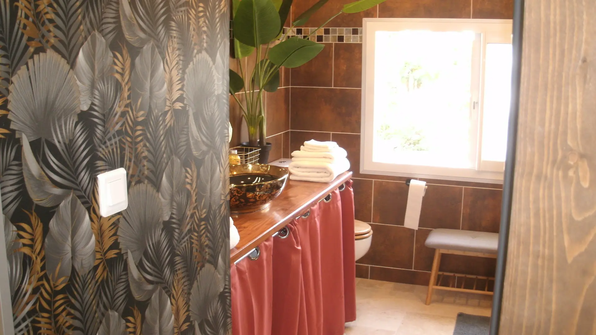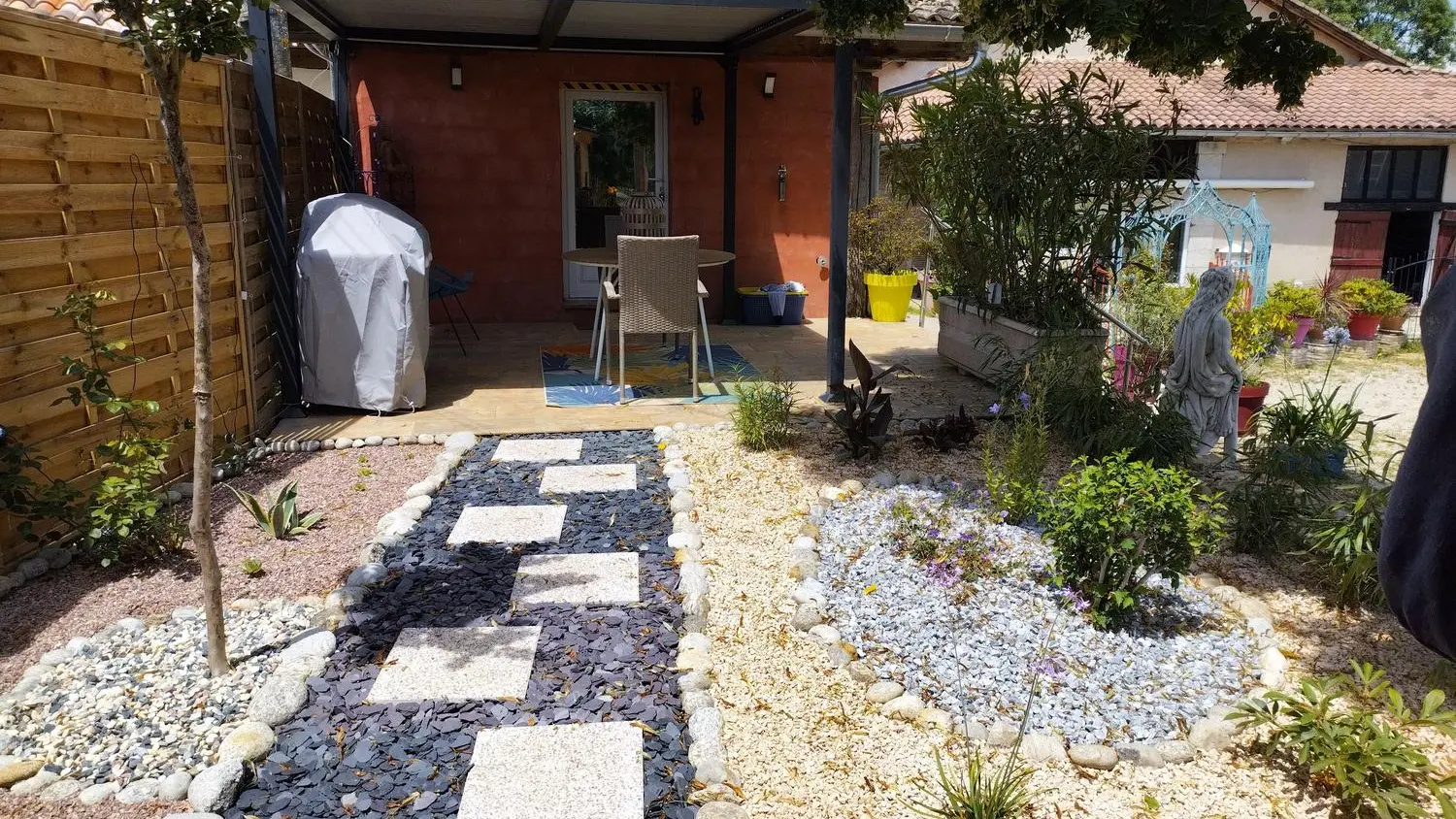 After a few steps from the car park, access to the terrace, garden furniture and pergola. One step leads up to the living area (fitted kitchen: fridge, freezer, hob, oven, microwave) with table and chairs. After 4 steps, the bedroom with 1 x 160 x 200 bed, sofa and TV. Bathroom with shower and bath, washing machine and tumble dryer. Bed linen and towels provided, included in the price. Free Wi-Fi in the accommodation. Essential oils for the Hammam. Bathrobes provided. From 1 May to 31 October, access to the shared swimming pool and spa.