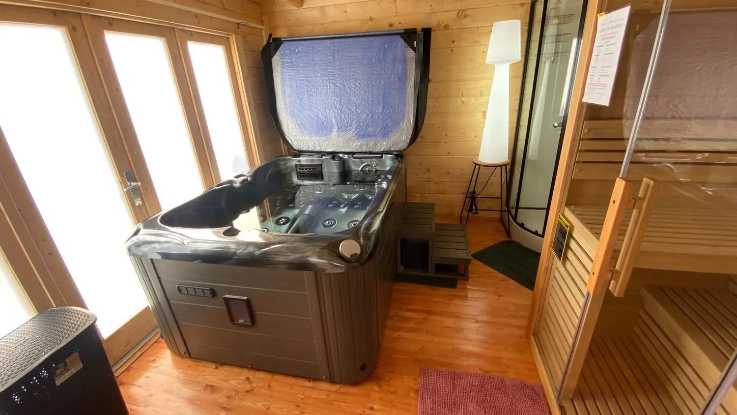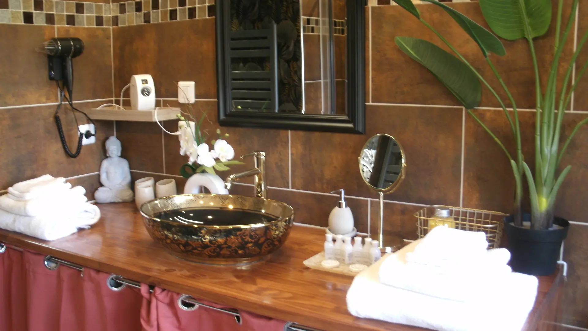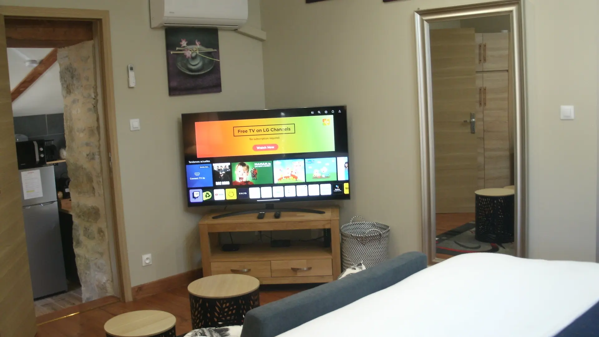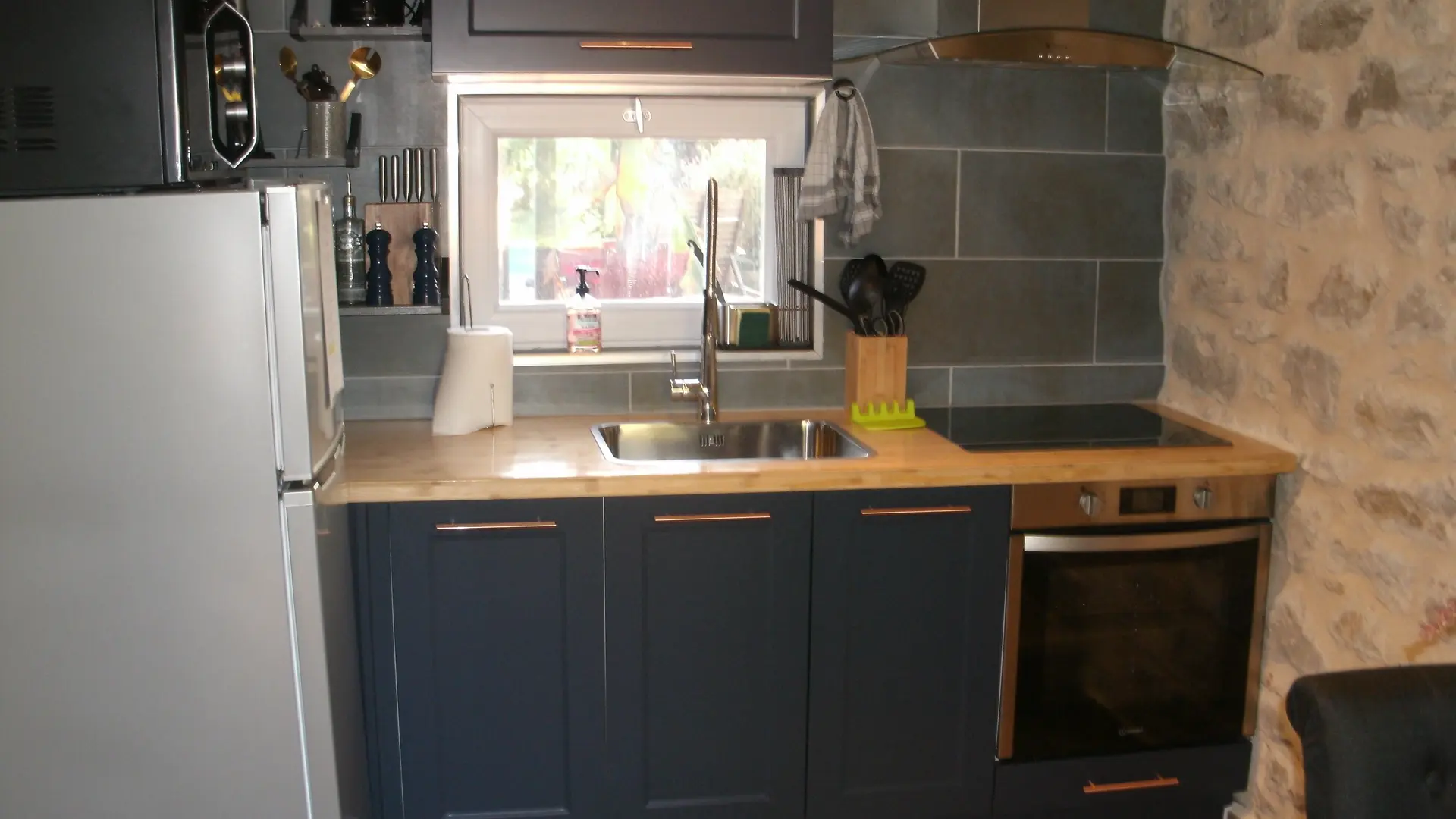 After a few steps from the car park, access to the terrace, garden furniture and pergola. One step leads up to the living area (fitted kitchen: fridge, freezer, hob, oven, microwave) with table and chairs. After 4 steps, the bedroom with 1 x 160 x 200 bed, sofa and TV. Bathroom with shower and bath, washing machine and tumble dryer. Bed linen and towels provided, included in the price. Free Wi-Fi in the accommodation. Essential oils for the Hammam. Bathrobes provided. From 1 May to 31 October, access to the shared swimming pool and spa.