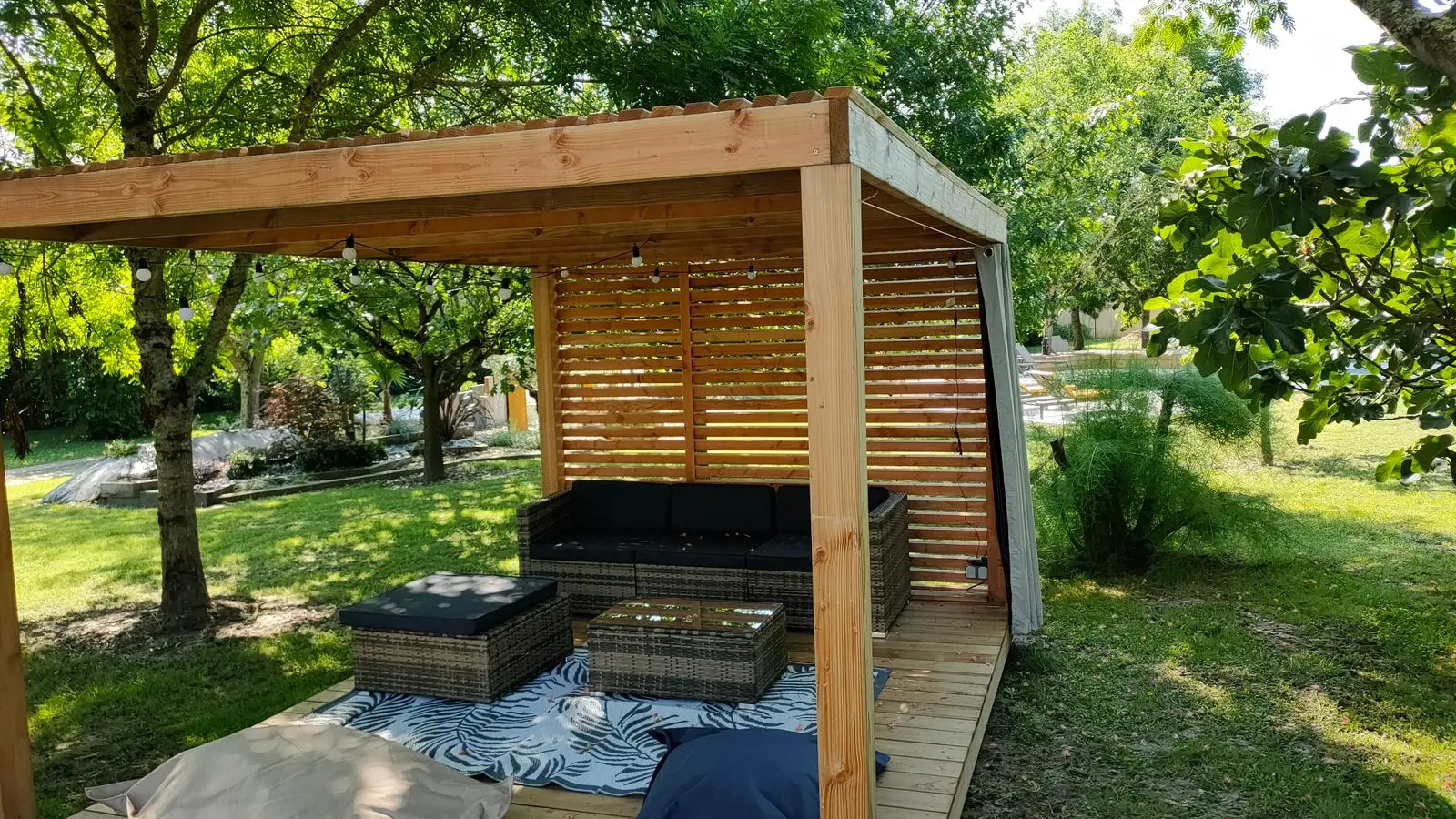 and in front of the gîte, the private swimming pool and a private lounge area under a wooden pergola, lit at night.