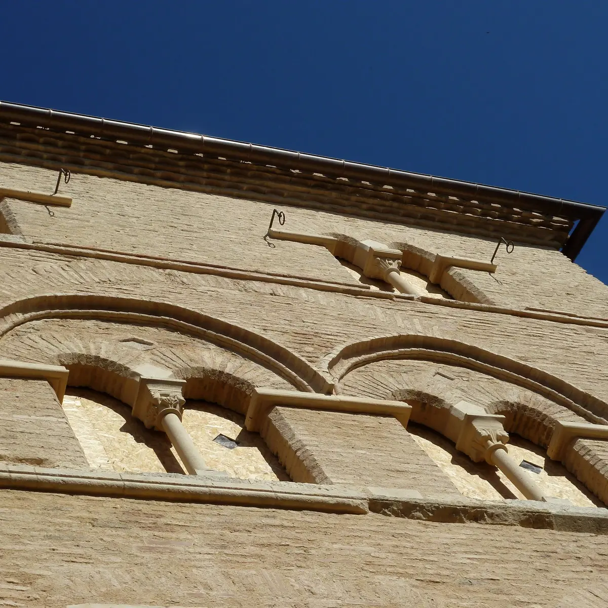 The tower has three floors, formerly devoted to social and domestic life, as well as a ground floor whose arcades indicate the presence of commercial spaces.