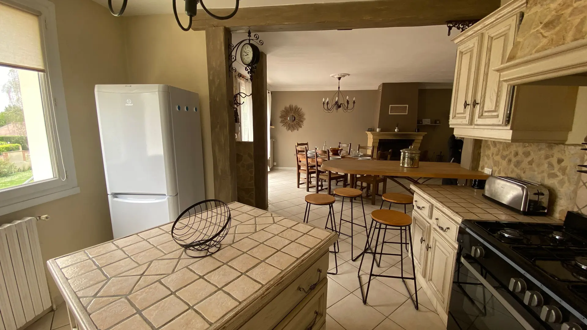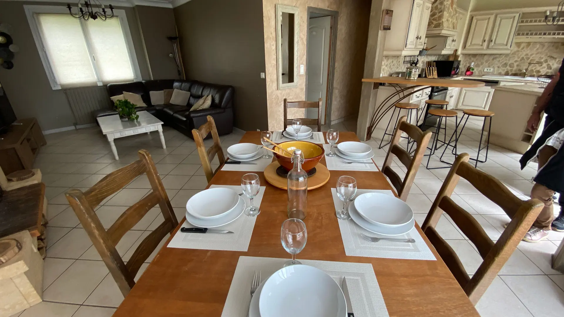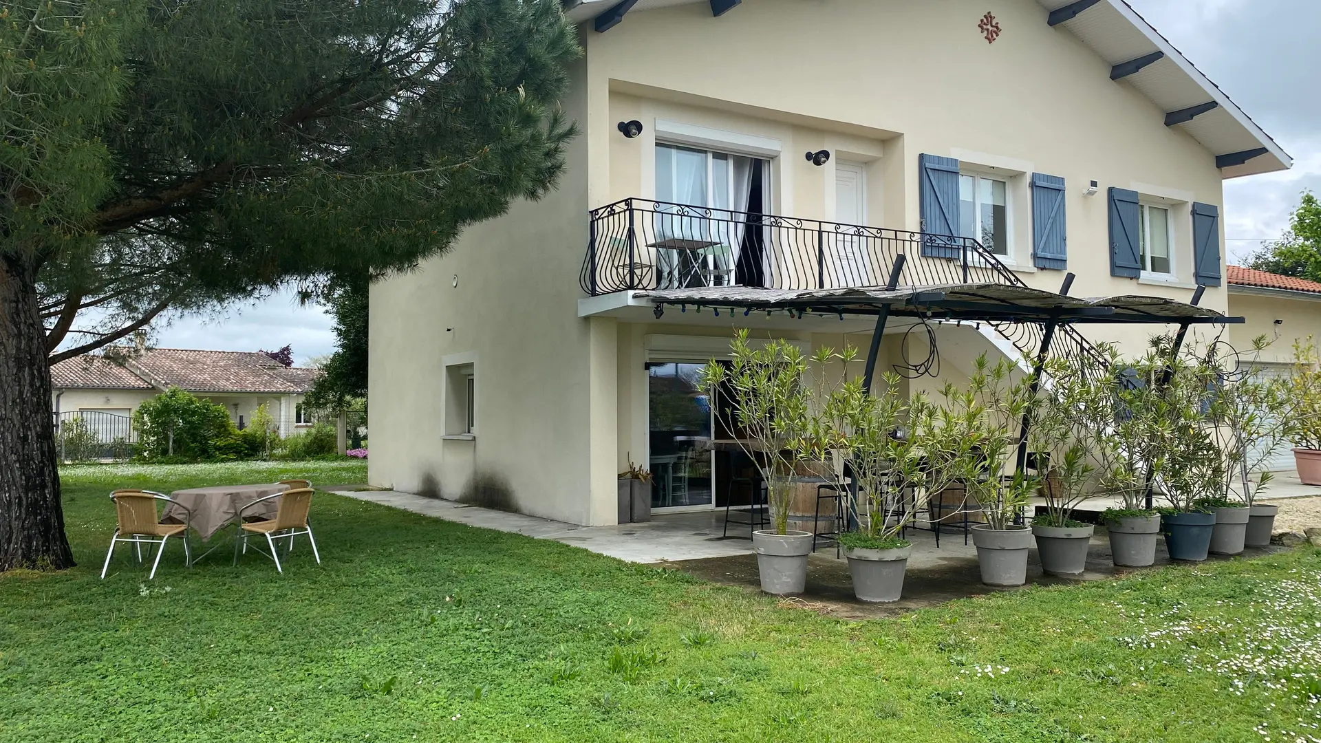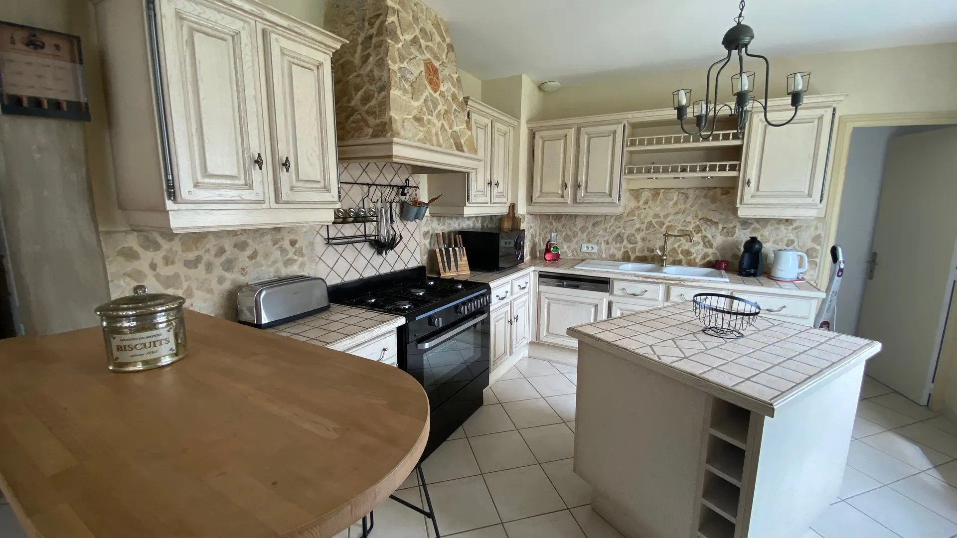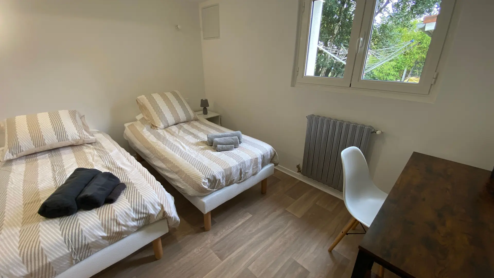 The accommodation comprises two interconnected areas, on the ground and ground floors, with all modern comforts. On the ground floor, there is a living room with a fitted kitchen (fridge-freezer, hob, oven, washing machine), table and chairs, corner sofa and TV. A bedroom (2 x 0.90cm beds), a bedroom (1 x 140cm bed) and a huge shower room with wc. Via an internal staircase and another external staircase, the 1st floor offers a large living room with fireplace (TV insert), corner sofa, dining area (table and chairs), and integrated kitchen area (cooking facilities, dishwasher, oven, microwave, fridge). Two bedrooms (2 single beds), one bedroom (1 double bed), shower room and separate wc. Balcony on first floor. Covered pergola with garden table and stools, string lights. Wifi throughout. Bed linen, towels and household linen provided and included in the price. Wood for the fireplace provided. Charcoal barbecue. Fenced garden with trees and gate. Bicycles can be stored at the rear.