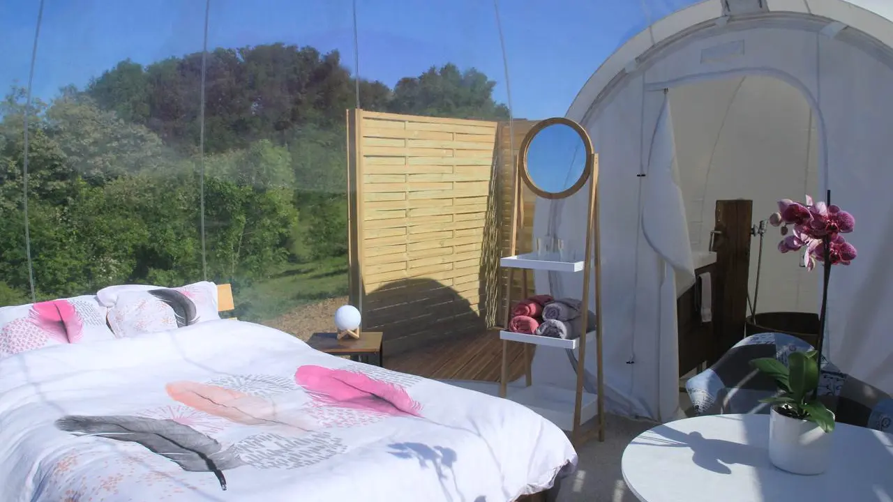 Located in Puycornet (Tarn-et-Garonne), 15 minutes north of Montauban, quietly placed on the hillsides of Quercy Blanc, the Venus bubble will welcome you as a couple, Lov'nuit also and up to 4 people, for one or Several nights under the stars. With some discreet dwellings upstream and a wood below, tranquility and omnipresent nature will delight lovers in search of dreams and serenity. At night and in the morning, you will not be safe from meeting a few deer, deer, or curious wild boars a few meters from you ...