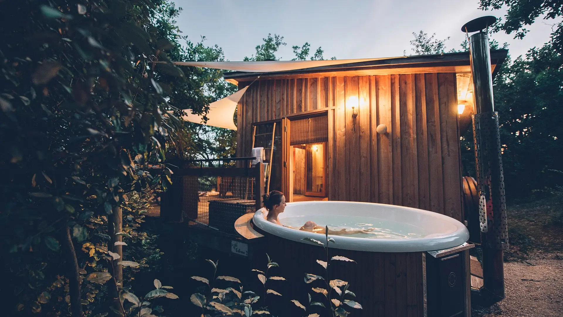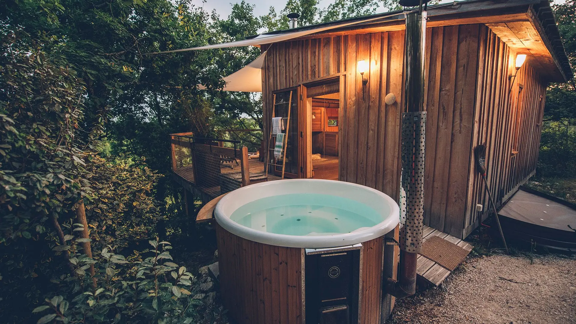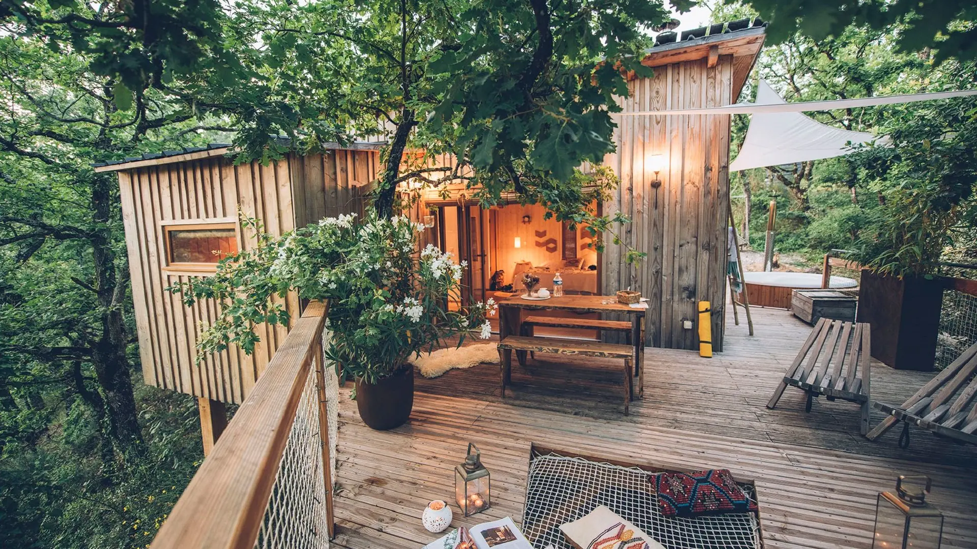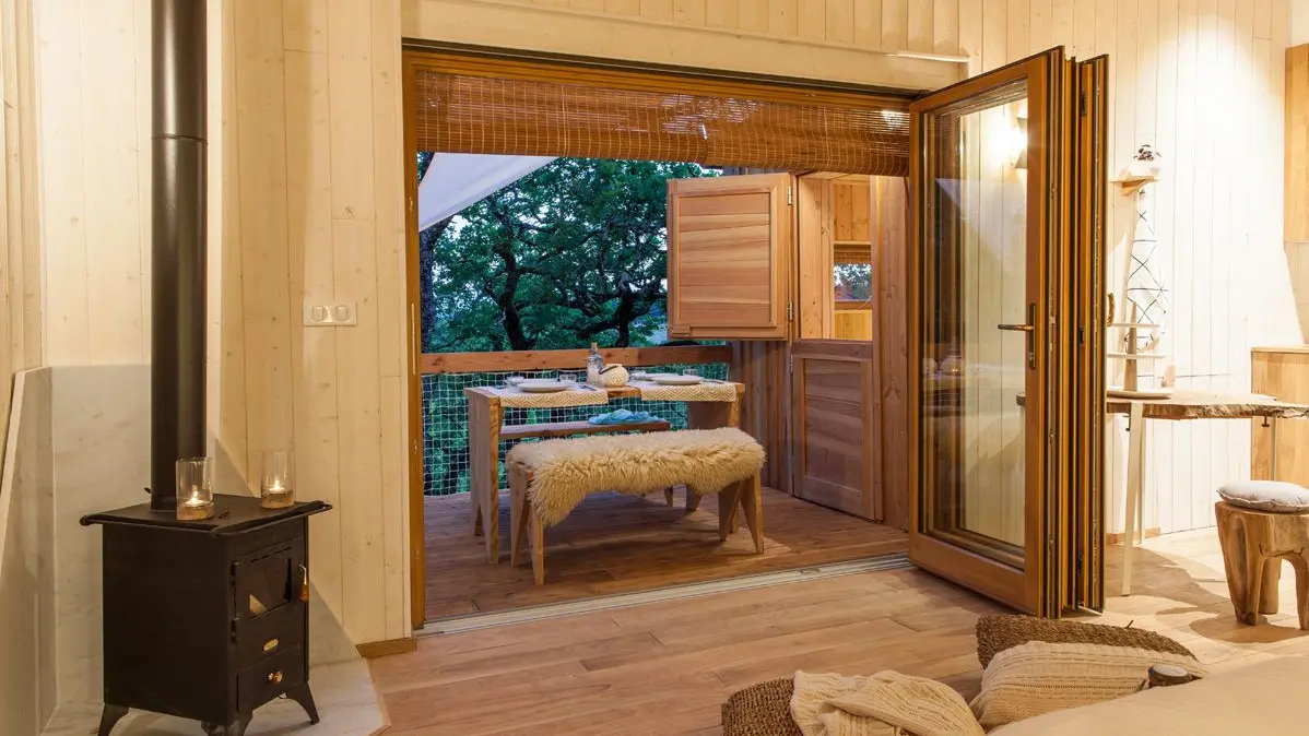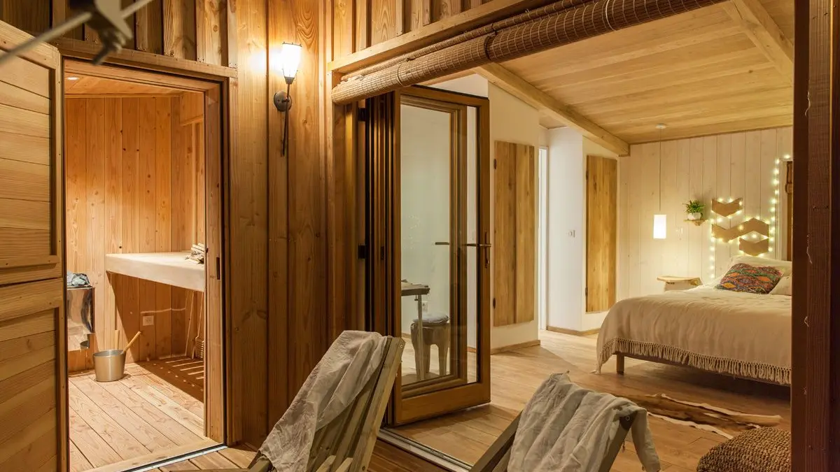 Treehouse layout: one large bedroom (1 x 160x200 bed), kitchen unit with built-in units, wood-burning stove, terrace with ornamental furniture and private Nordic bubble bath. From the terrace, access to the private sauna in a separate room that can be used as an extra bedroom (2 x 70cm beds). Access to the owner's swimming pool and tennis court 100 metres away.
