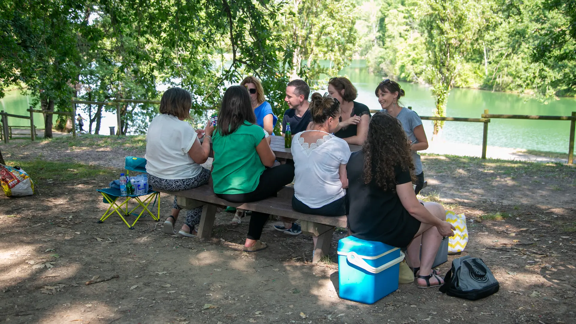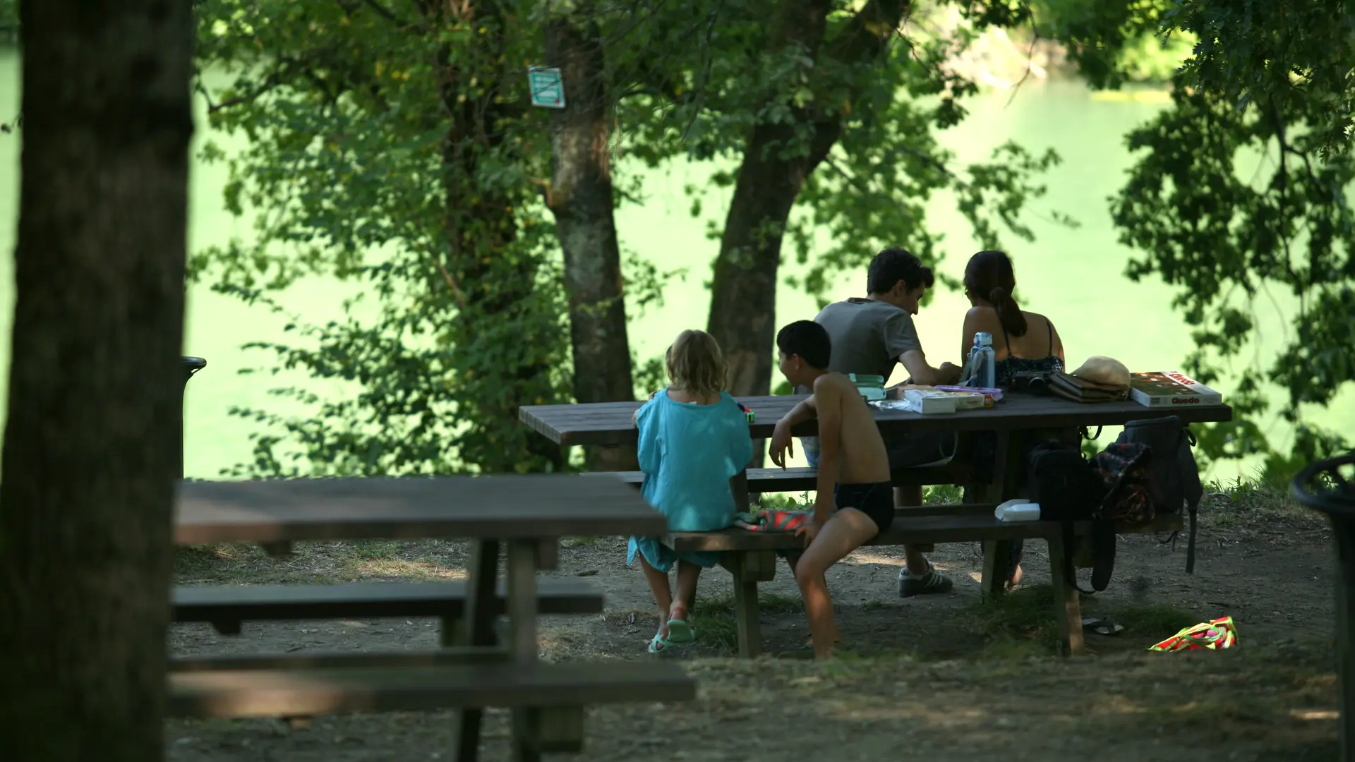 Shaded tables with integrated benches: comfortable spaces to set up your picnic.