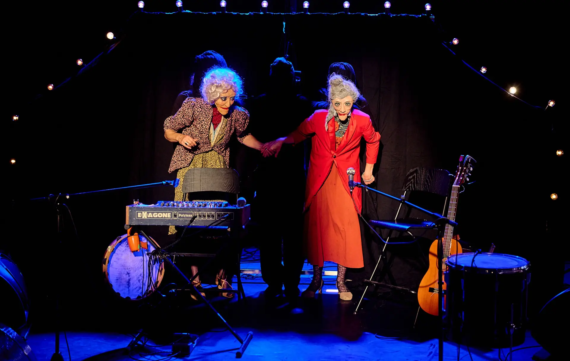 Two human-sized puppets, two old Sicilian singers whose music inhabits them with the intensity of women who have lived, but never admit defeat. As frail and delicate as two old branches, with a trickle of guitar and a torrent of voice, they bite you in the heart, then, with a blast of technoid synthesizer, plunge you into panic-stricken laughter, with all the insolence these beloved divas can afford, and who have nothing left to prove but their friendship and the joy of still being in this world, together.