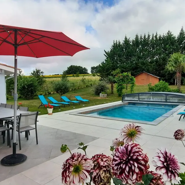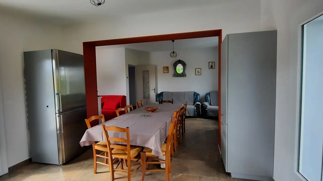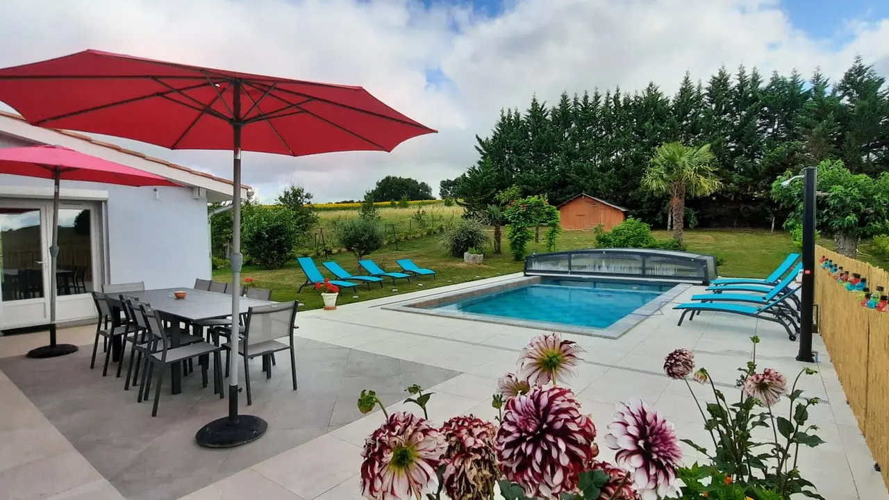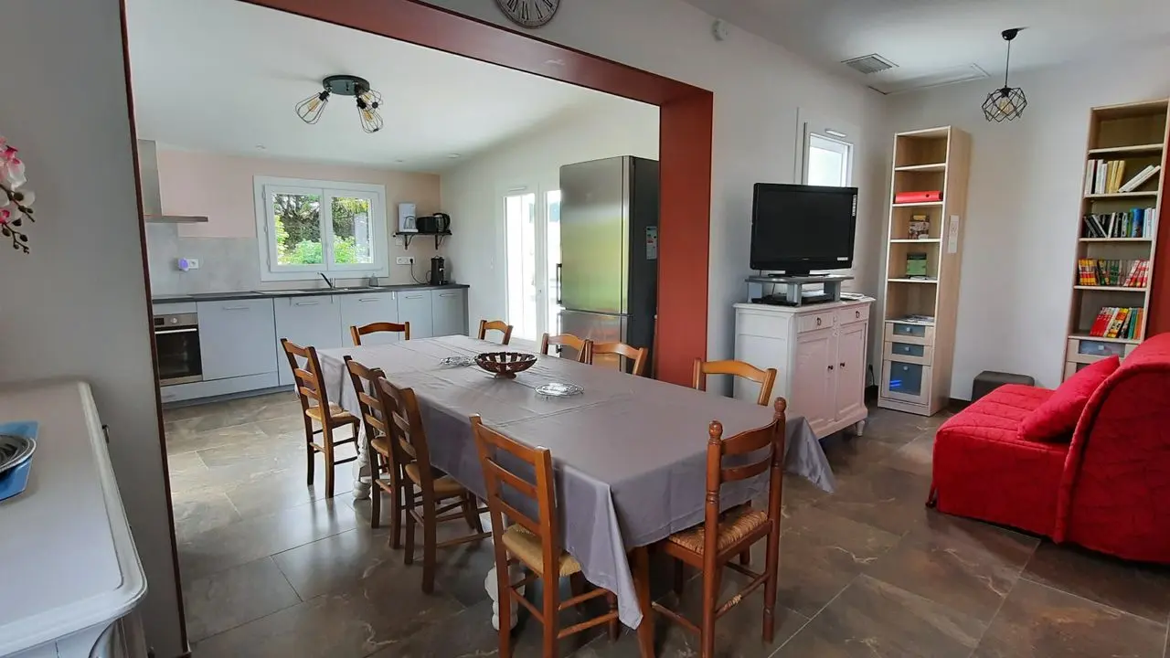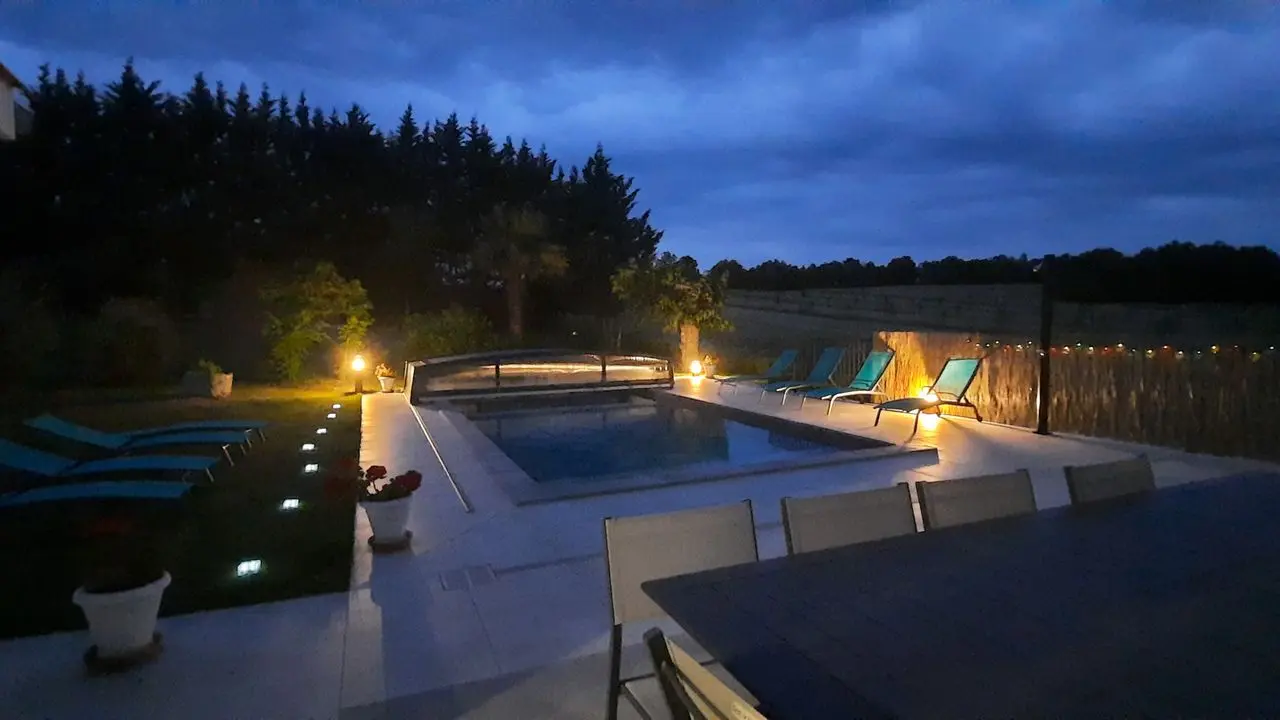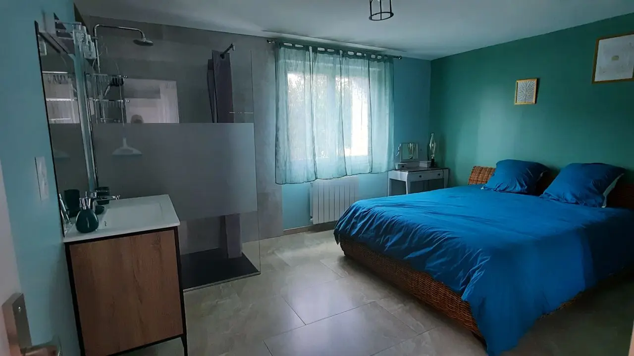 El alojamiento es en dos niveles. En la 1ª planta, salón con zona de estar (un sofá, dos sillones, TV, juegos de mesa), comedor y cocina equipada (lavavajillas, microondas, frigorífico, congelador). Un pasillo conduce a 2 dormitorios con 1 cama doble cada uno, 1 dormitorio con 2 literas, 1 baño con ducha, 1 WC, 1 área de lavado (lavadora y secadora). Dos terrazas en un nivel, una con vista a la piscina y la otra a la cocina, ideal para desayunos y comidas. Muebles de jardín para cada una de las terrazas y plancha. En la planta baja, por escalera interior, 1 dormitorio con 1 cama de 160, 1 ducha y 1 lavabo. En el pasillo un WC adicional. Wifi en la cabaña. Suministro de toallas, ropa de cama y ropa de hogar incluido en el precio. Calefacción de invierno incluida. Terreno vallado. Aparcamiento privado cerrado. Alojamiento con aire acondicionado.