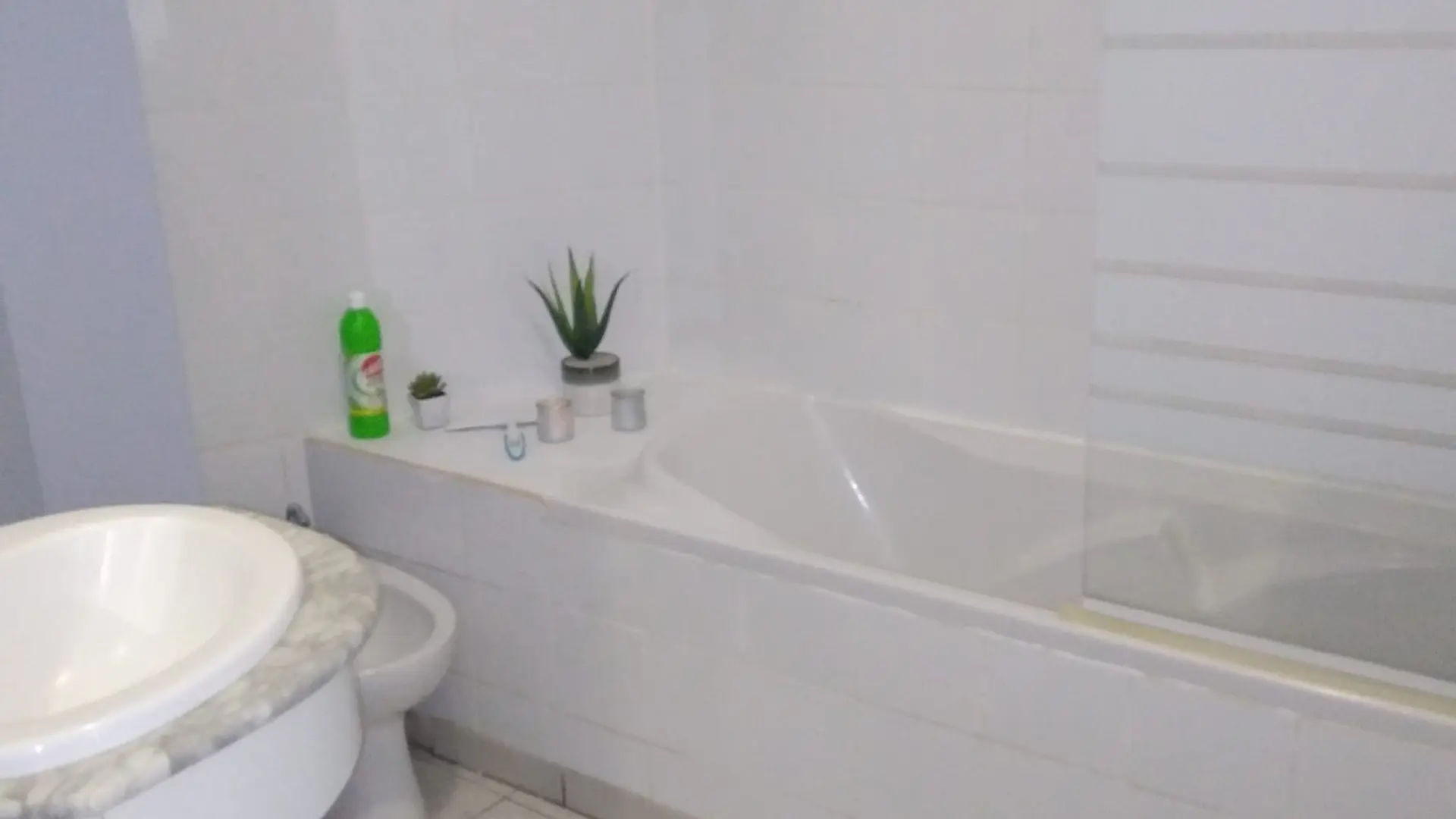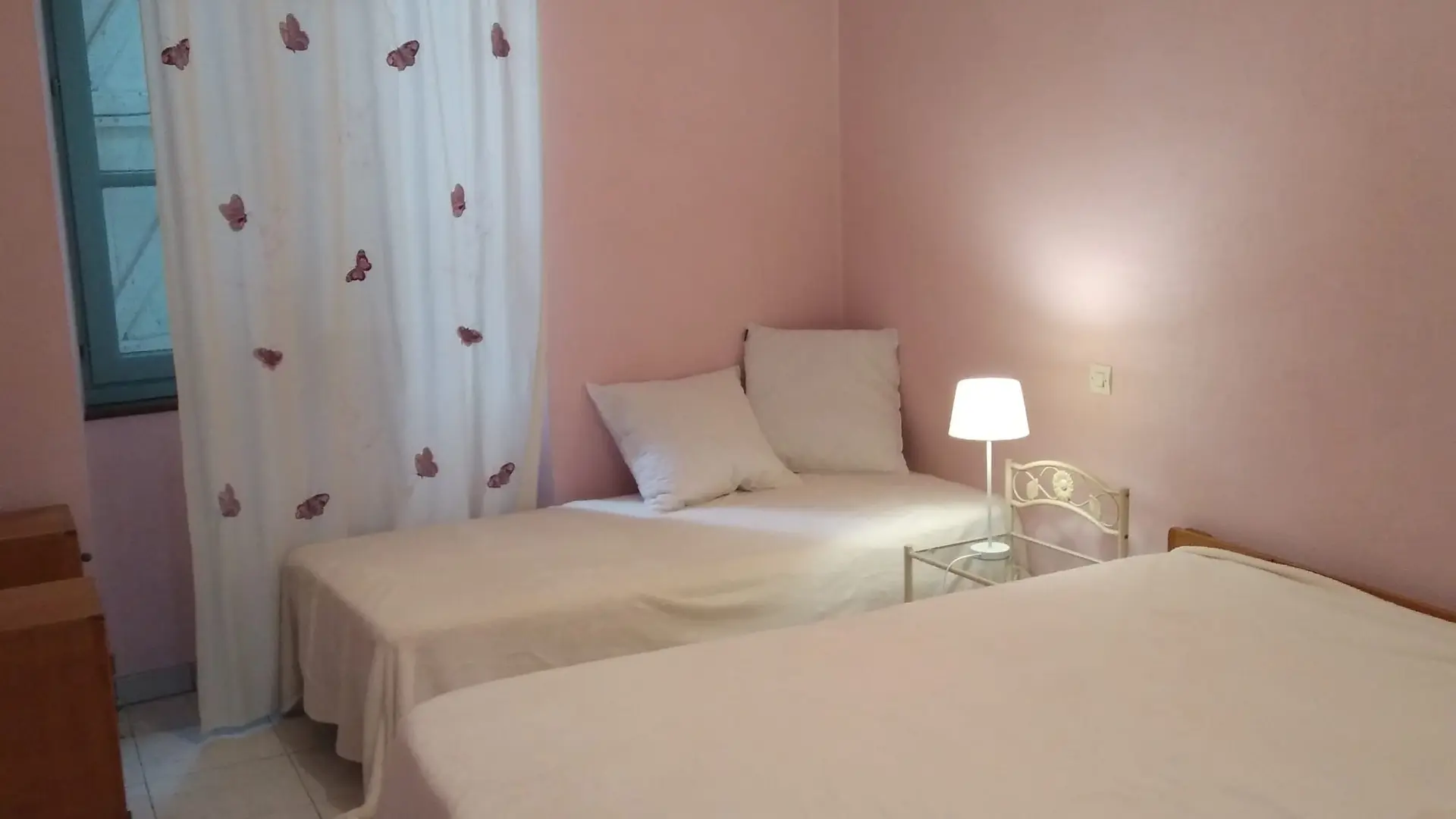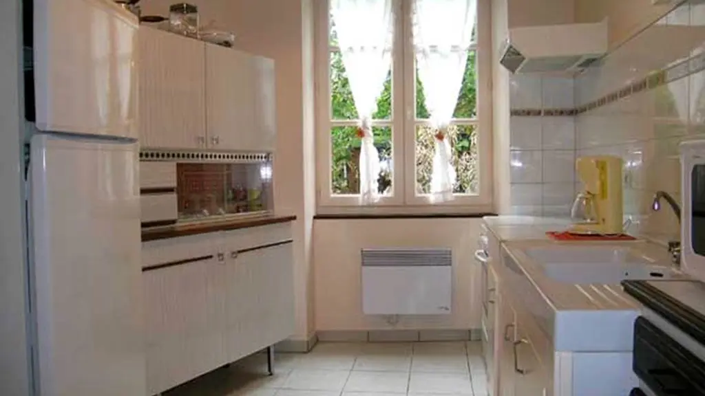 Este apartamento amueblado, al que se accede por la entrada común, consta de un gran salón con sofá cama (1 persona), una cocina totalmente equipada (microondas, frigorífico-congelador, lavadora), un dormitorio con cama doble (140 cm) y cama individual (90 cm), y un cuarto de baño con aseo.