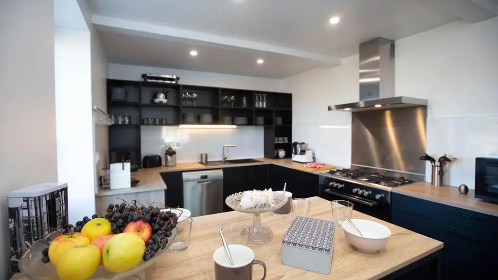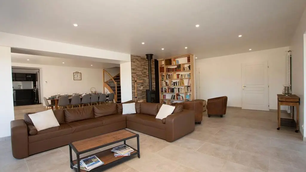 Planta baja: 1 sala de estar grande con 1 sala de estar (sofá de esquina, TV), comedor (mesa y sillas para 14 personas), área de biblioteca con estufa de leña, cocina (elementos integrados, 1 piano de cocina con horno XL, LV, nevera, congelador), 1 cuarto de lavado (secadora, lavadora), 1 baño accesible, 1 habitación (1 cama doble) accesible para personas con movilidad reducida con baño privado.