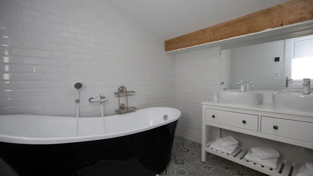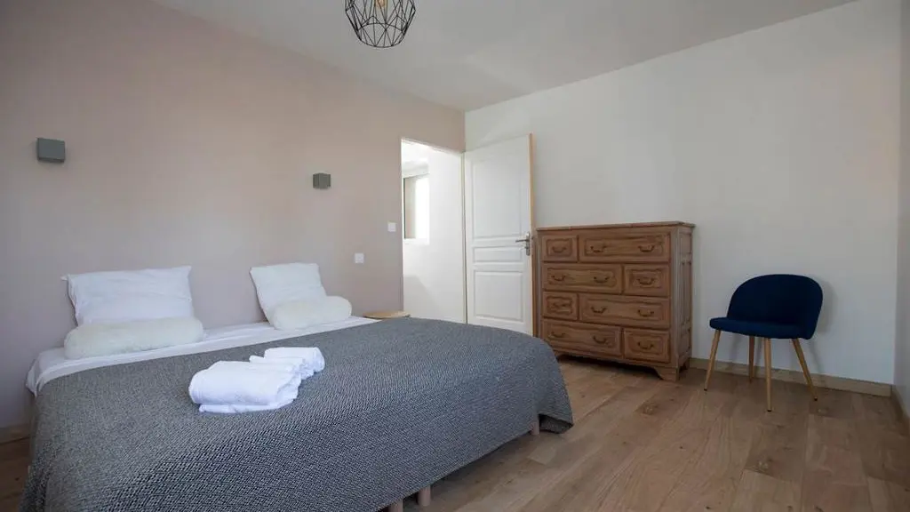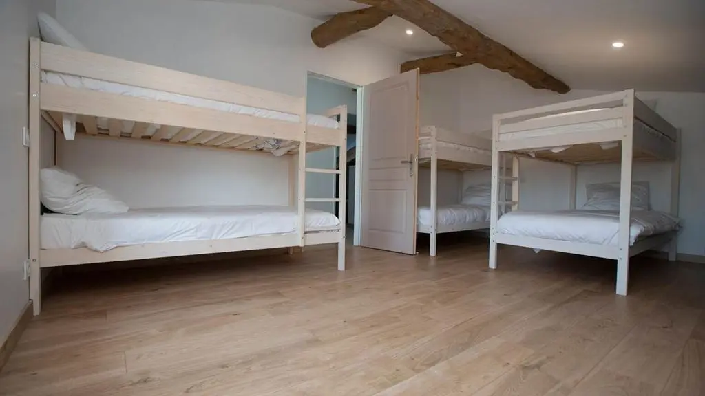 En el 1er piso: 3 dormitorios (1 cama de 180 cada uno), 1 baño con ducha, 1 baño, 1 aseo, 1 dormitorio (3 literas o 6 camas).