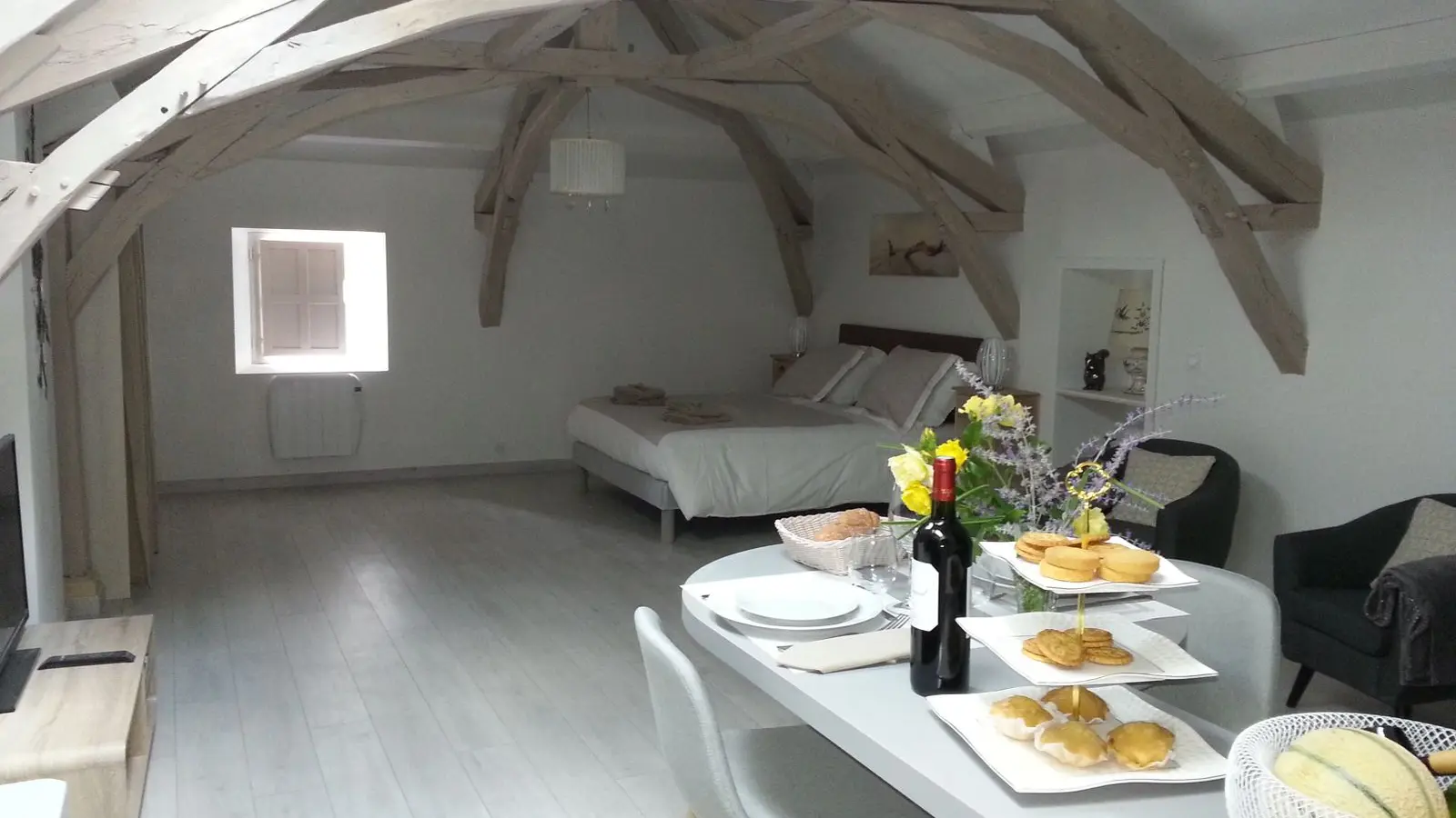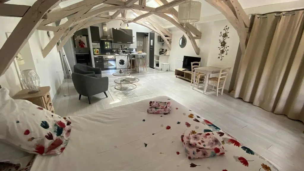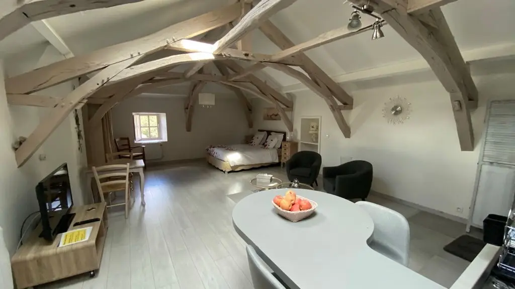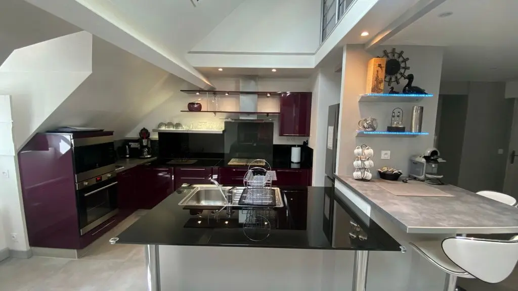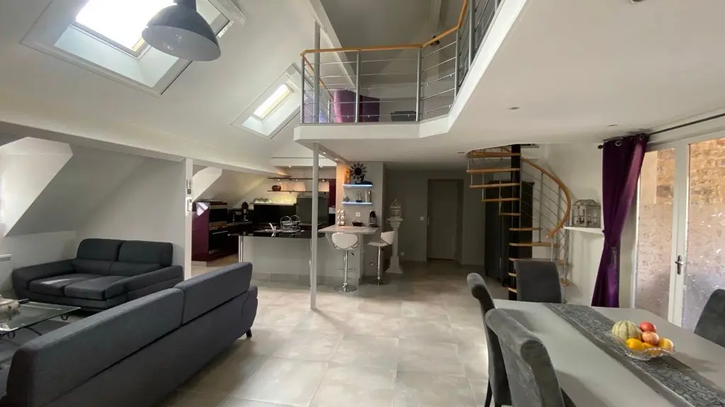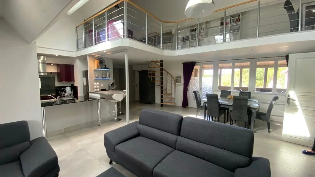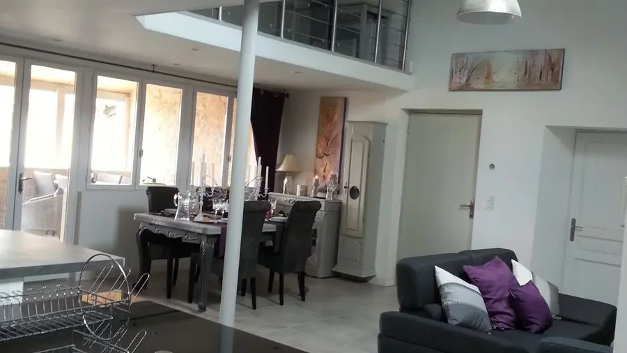 El loft incluye: una sala de estar con área de cocina (Elementos integrados LV Four Mo Refrigerator, congelador) y sala de estar frente a la chimenea de inserción, 2 sofás (TV, reproductor de DVD), un comedor (mesa y 6 sillas); Un armario técnico (lavadora, secadora), un inodoro independiente (lavado de manos y mesa de cambio de pared); Un dormitorio (1 cama 160 vestidor y 1 baño privado (1 cuenca, ducha), un dormitorio (2 cerca de 0.90 camas, vestidor y 1 baño privado (1 cuenca, ducha) y acceso a una terraza cubierta con una mesa de jardín , 6 sillas, barbacoa, 2 sillones, 1 mesa de café y un banco. En el nivel superior por una escalera de caracol, en entrepiso un espacio para niños con biblioteca, 2 sillones de café y una oficina).