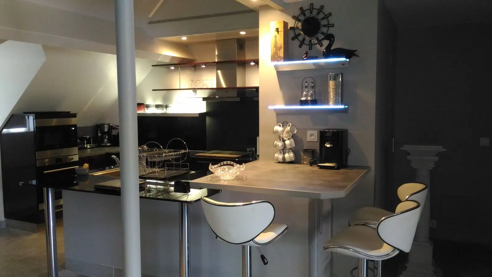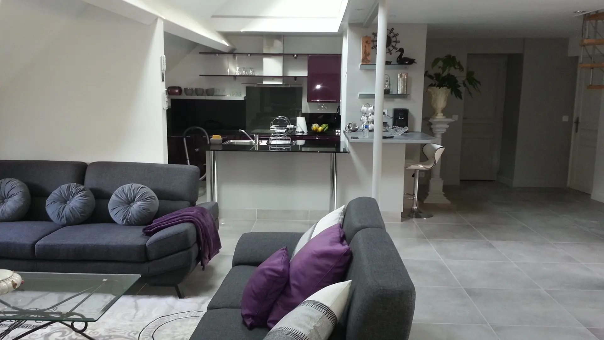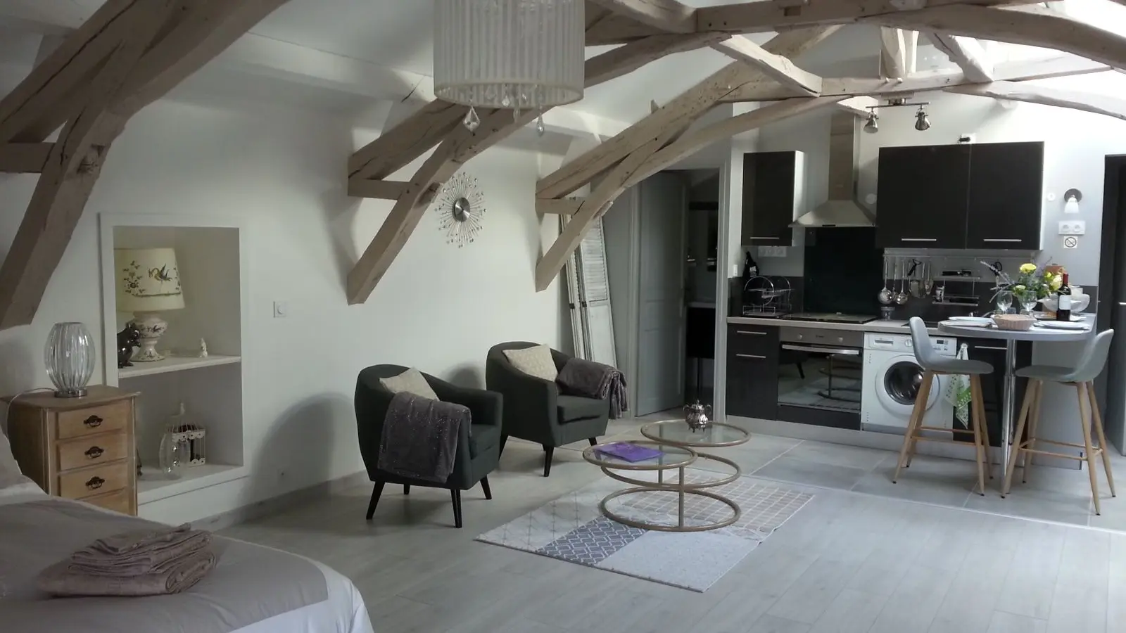 El loft incluye: una sala de estar con área de cocina (Elementos integrados LV Four Mo Refrigerator, congelador) y sala de estar frente a la chimenea de inserción, 2 sofás (TV, reproductor de DVD), un comedor (mesa y 6 sillas); Un armario técnico (lavadora, secadora), un inodoro independiente (lavado de manos y mesa de cambio de pared); Un dormitorio (1 cama 160 vestidor y 1 baño privado (1 cuenca, ducha), un dormitorio (2 cerca de 0.90 camas, vestidor y 1 baño privado (1 cuenca, ducha) y acceso a una terraza cubierta con una mesa de jardín , 6 sillas, barbacoa, 2 sillones, 1 mesa de café y un banco. En el nivel superior por una escalera de caracol, en entrepiso un espacio para niños con biblioteca, 2 sillones de café y una oficina).
