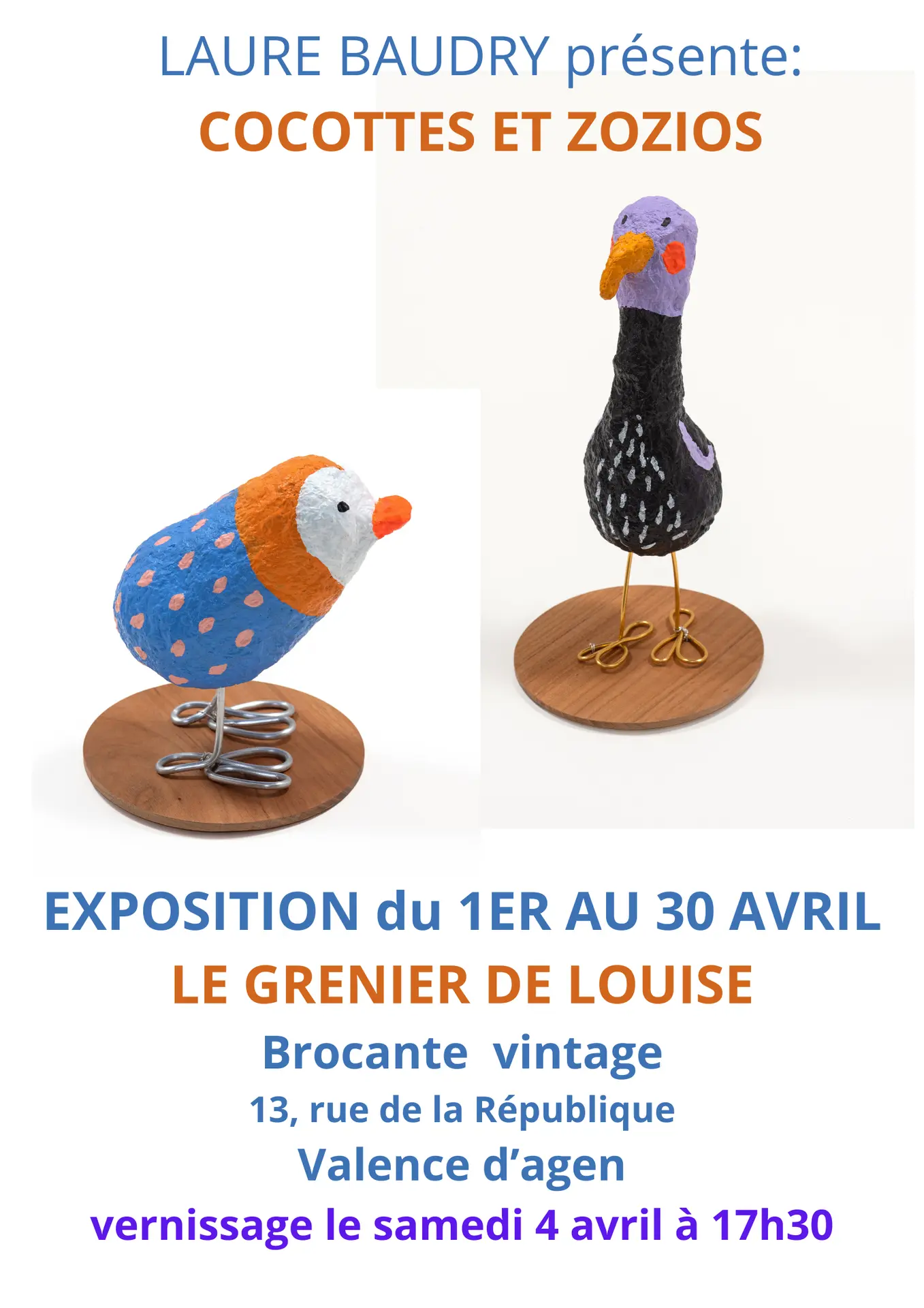 Descubra la exposición "Cocottes et Zozios" de Laure Baudry, presentada en Le Grenier de Louise, una encantadora tienda de antigüedades vintage.
