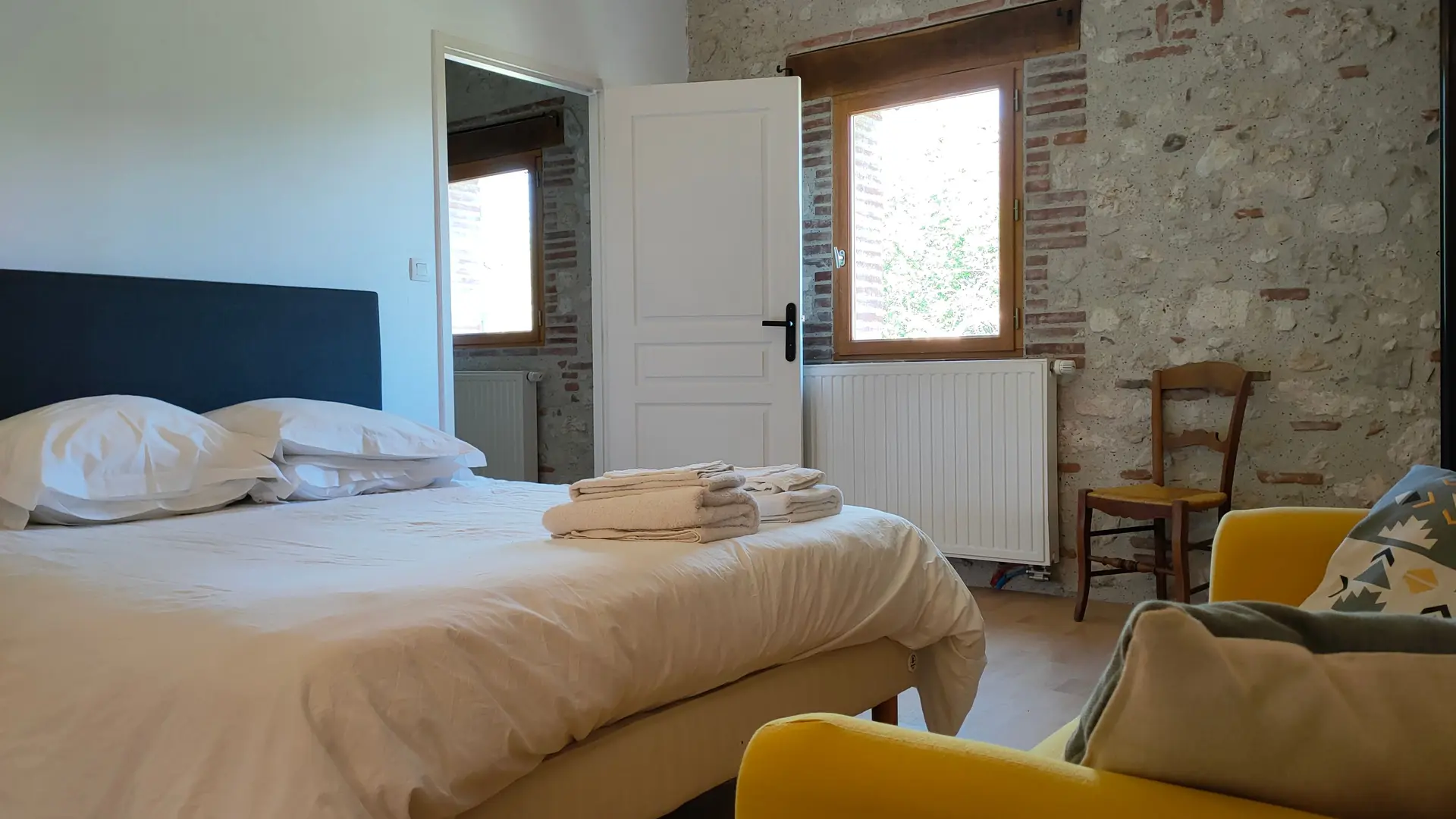 En la planta superior, el dormitorio principal cuenta con una cama de 160 cm, un baño con bañera y una amplia ducha. Hay otras dos habitaciones: una con dos camas de 90 cm y otra con una cama de 140 cm. También en esta planta, hay un cuarto de baño con ducha y un aseo separado.