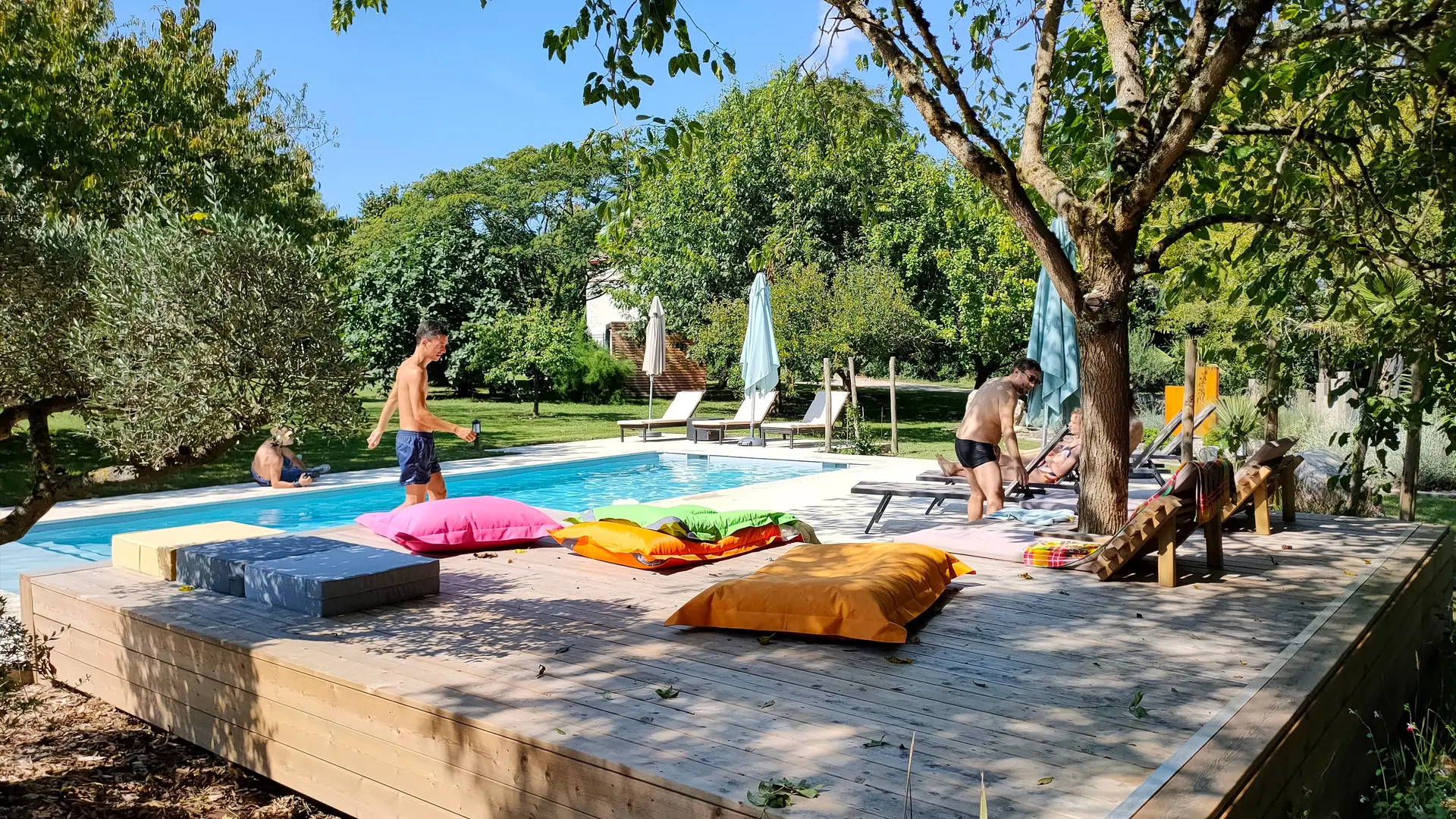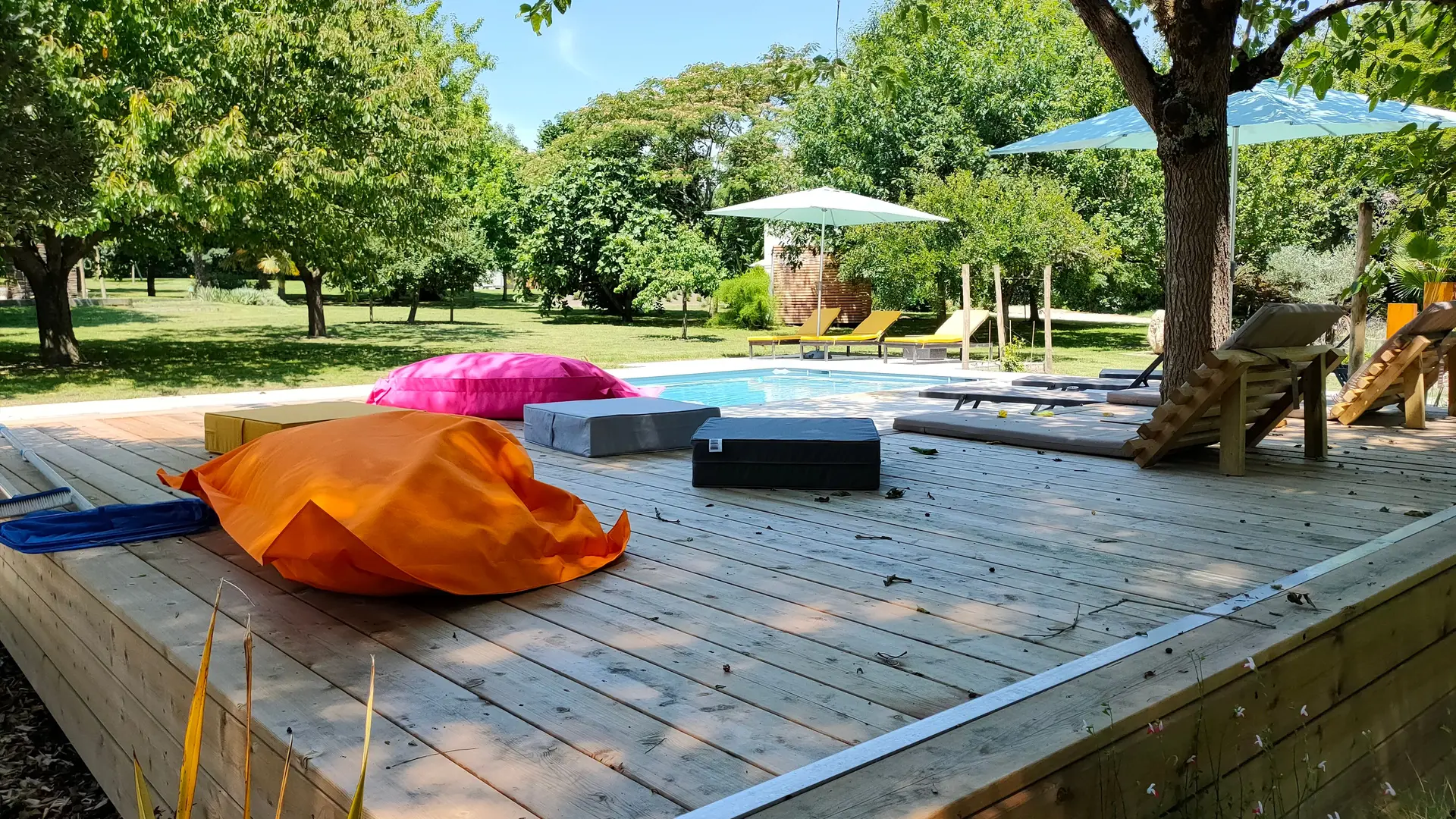 El parque que rodea la casa rural está plantado con numerosos árboles frutales que proporcionan sombra y frescor.