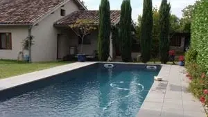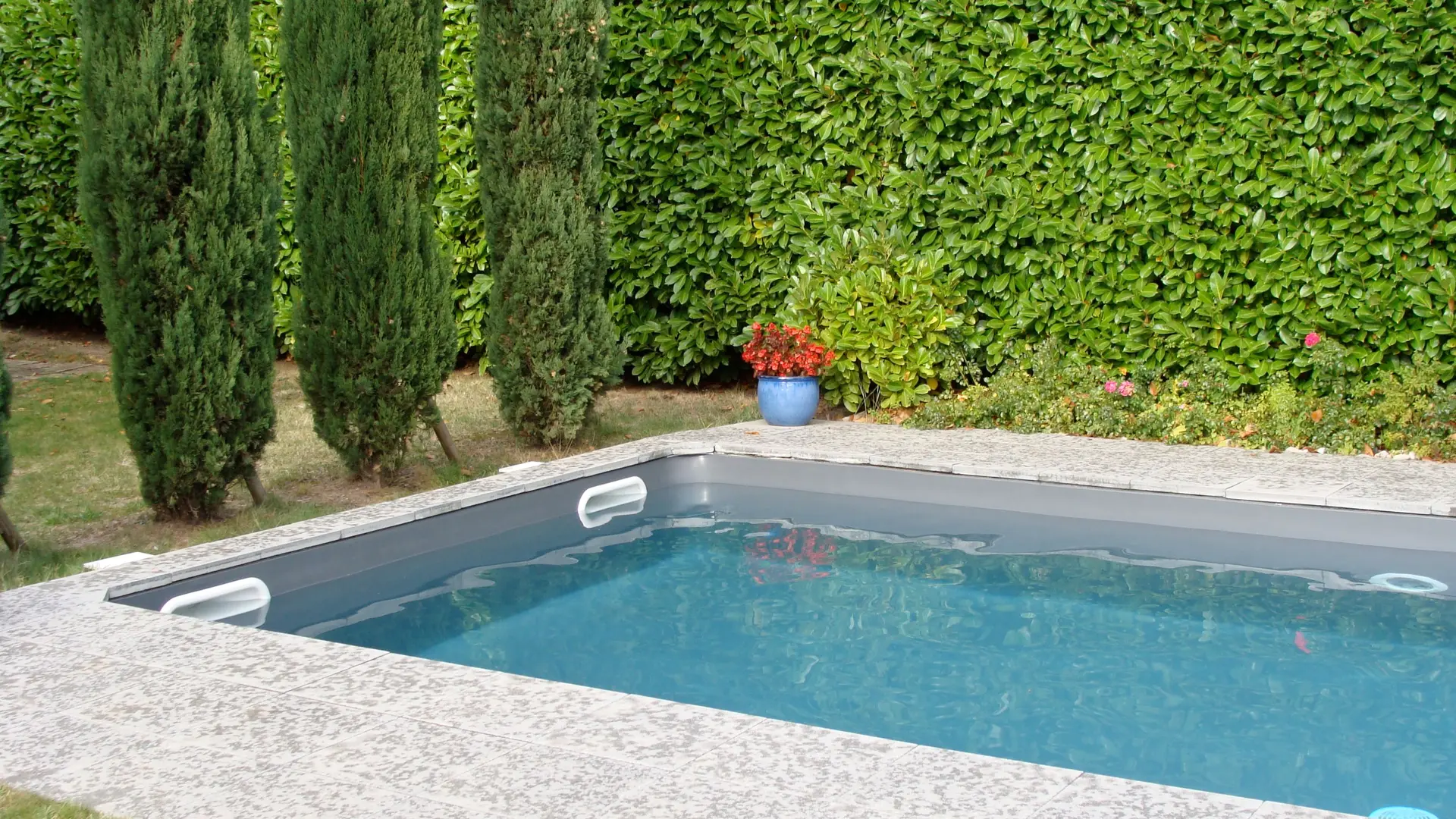 Afuera, la piscina estructura el jardín cercado.