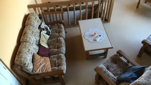 Planta baja: Salón con sofá y televisión, zona de cocina totalmente equipada (microondas, lavadora), despensa con secadora, WC separado con lavabo.