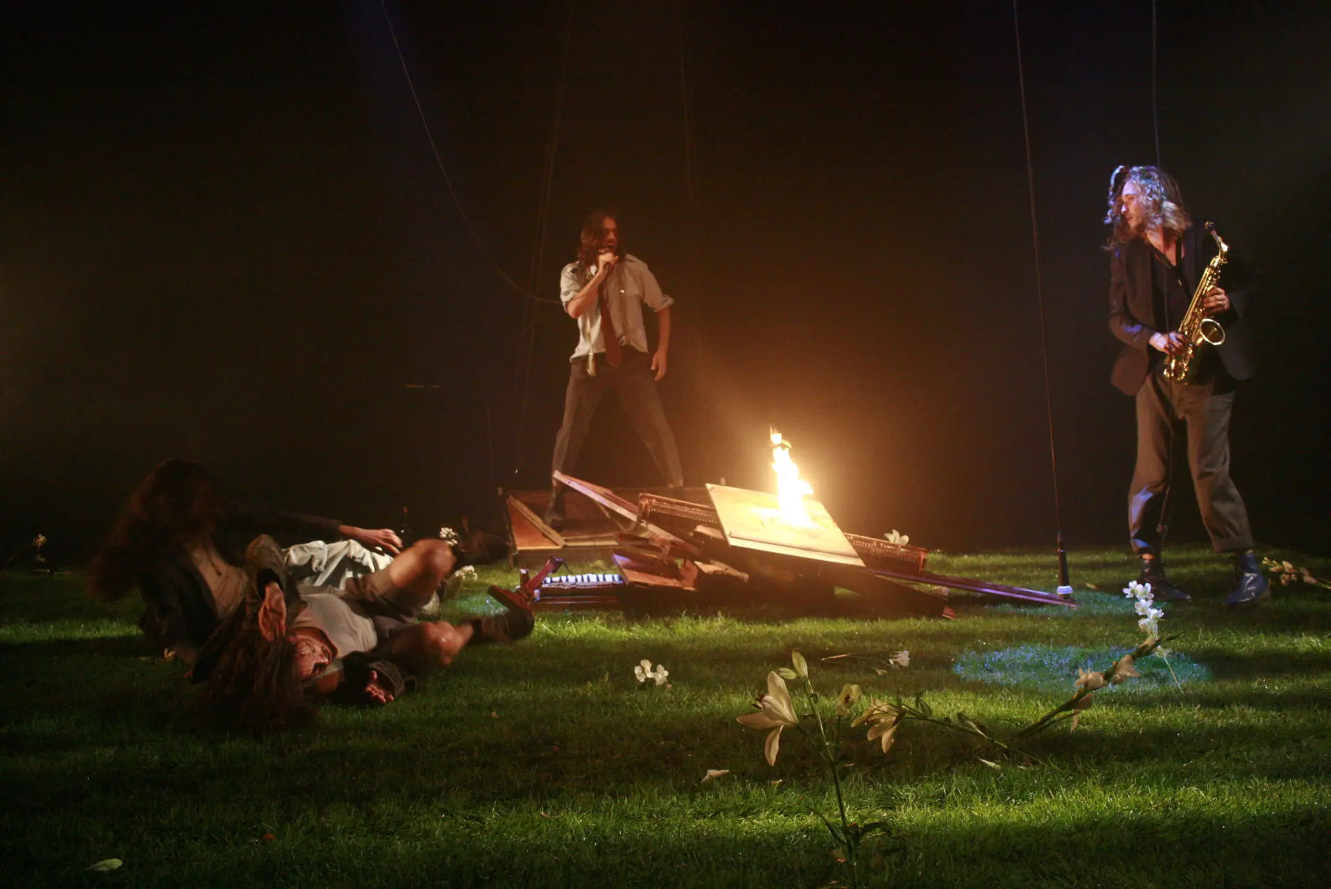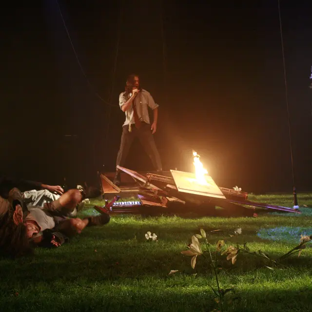 En un espacio atemporal y depurado: un cuadrado cubierto de hierba y flores, donde la sombra y la luz conducen a las estrellas, los actores-músicos crean un universo sonoro en directo perfectamente engrasado. Guitarra, saxofón, trompeta, batería, beatbox, canto… Exploran todas las temáticas rimbaudianas. Los cuerpos están totalmente habitados por la palabra y sumidos en trance por las palabras; es una carrera hacia el infierno, la belleza y la eternidad...