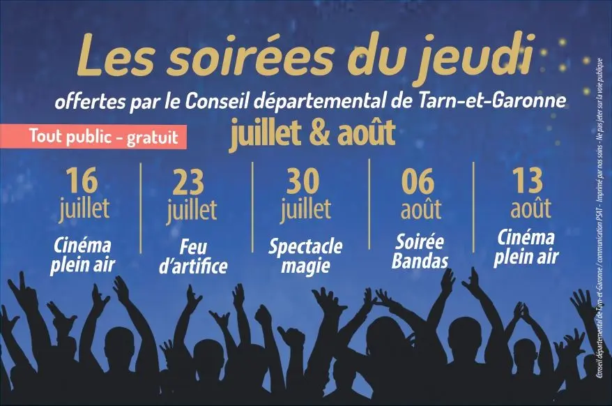 Este verano, disfrute de unas veladas inolvidables al pie de la confluencia de los ríos Tarn y Garona. 16 de julio: cine al aire libre. 23 de julio: Fuegos artificiales. 30 de julio: Espectáculo de magia. 06 de agosto: Velada de Bandas. 13 de agosto: Cine al aire libre.