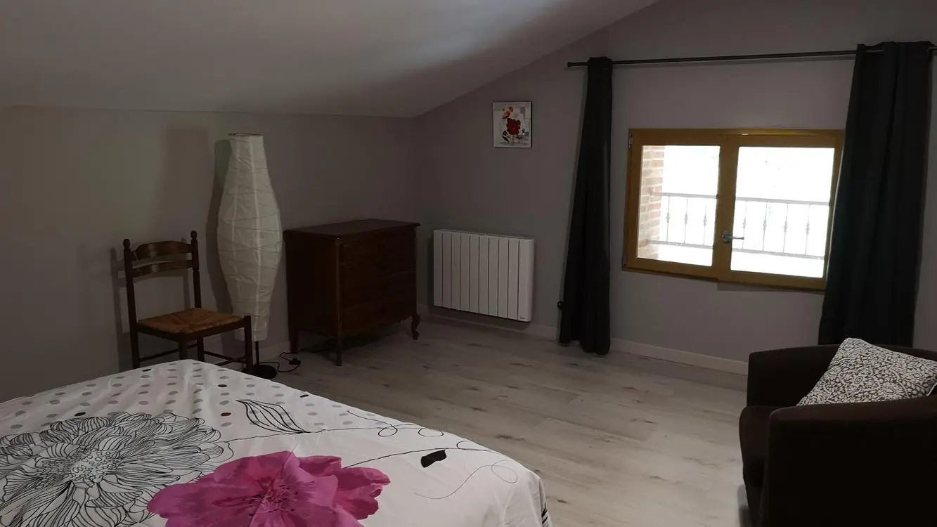 Arriba, un dormitorio abuhardillado con gran armario, cómoda y sillón permite admirar el campo.
