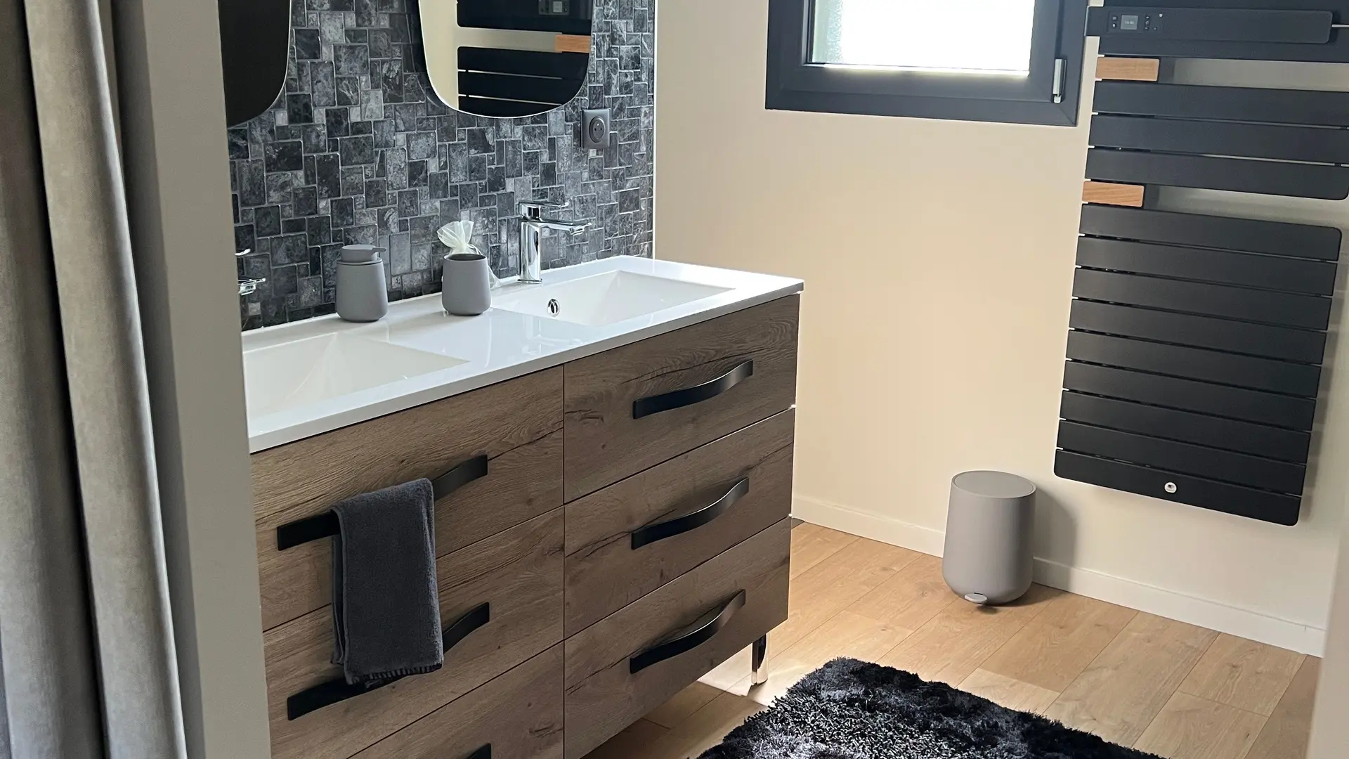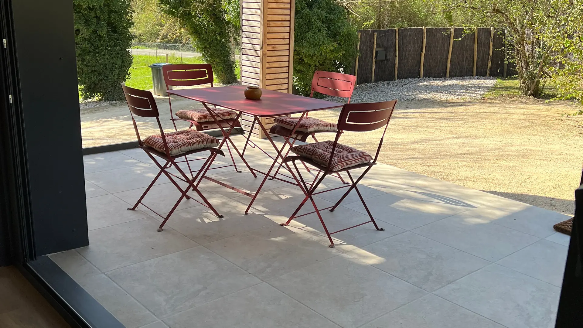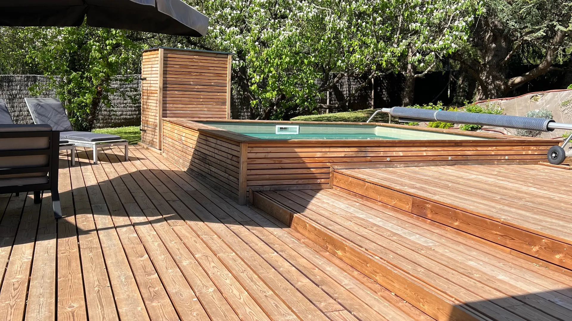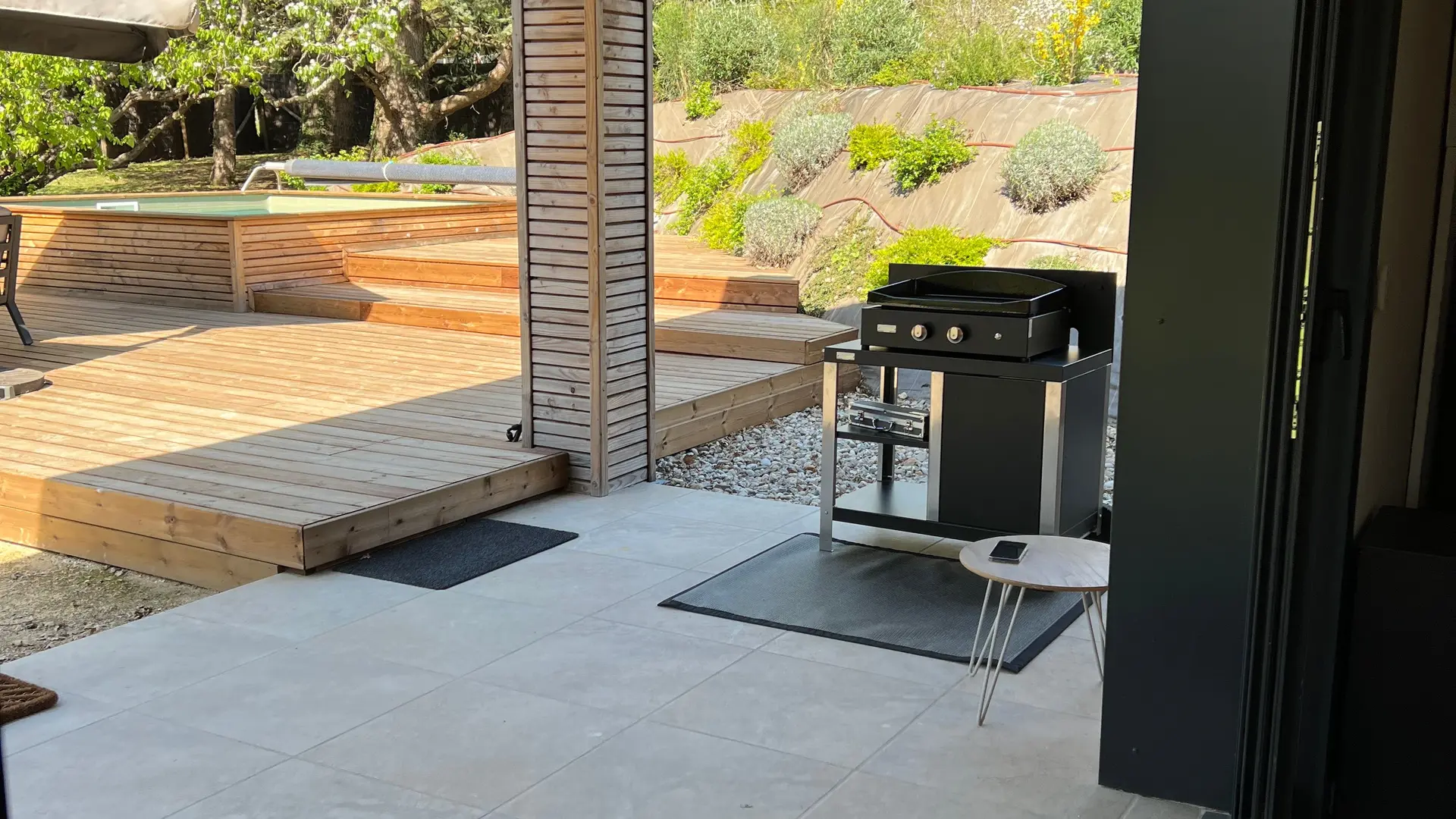 Terraza privada de madera (80m2) donde se encuentra la piscina privada cuadrada. Terraza delante del salón con muebles de jardín, barbacoa. Aparcamiento privado.