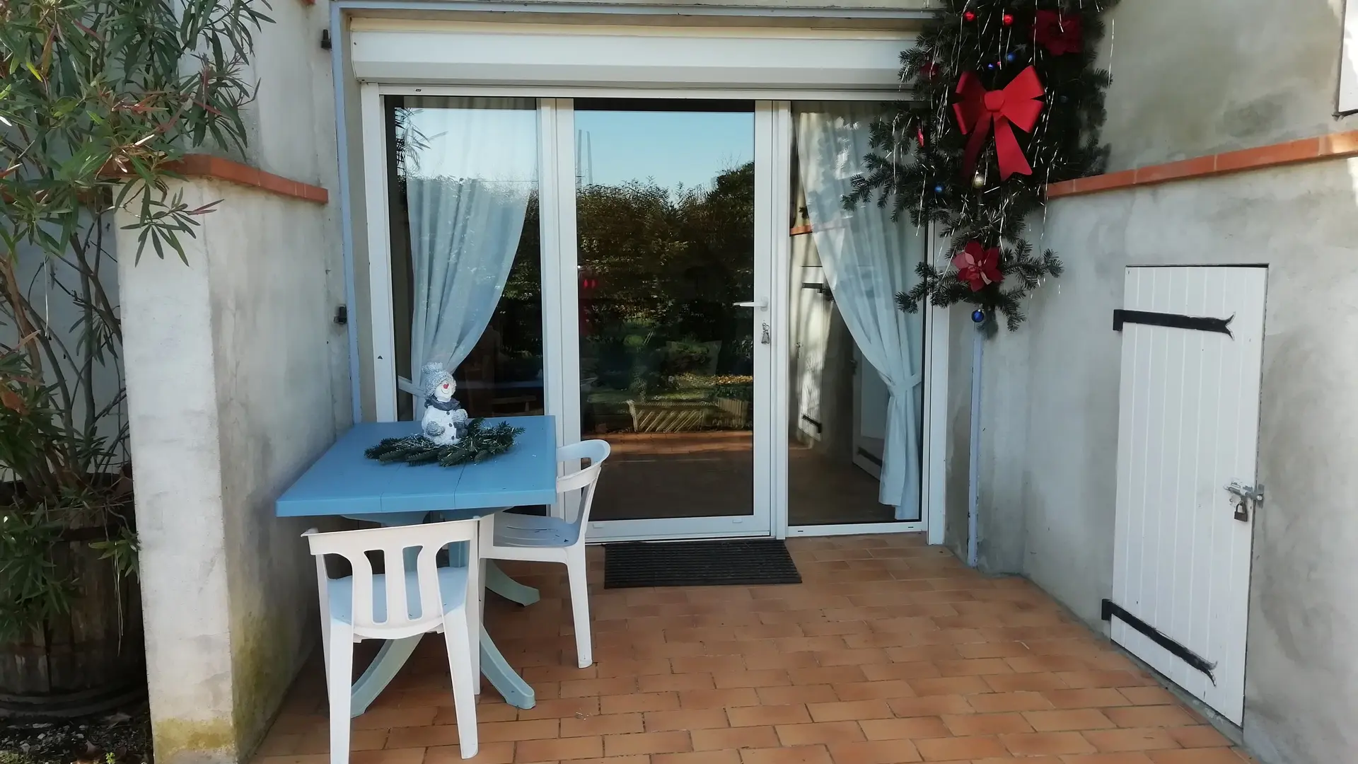 Terraza privada con muebles de jardín para un dormitorio. En el sitio 1 rural gîte 3 oídos. Acceso a Internet posible en la casa de huéspedes.