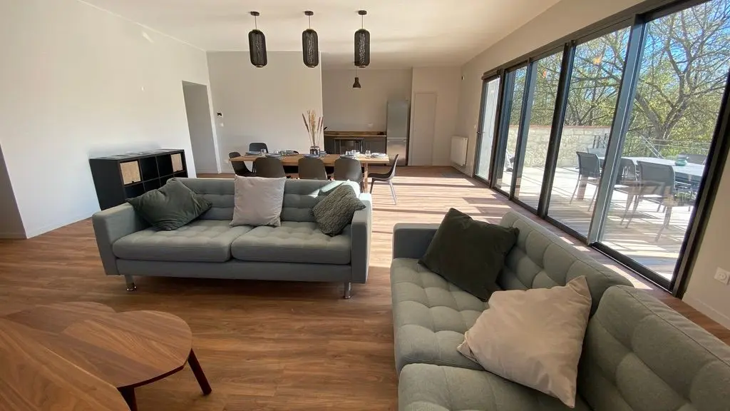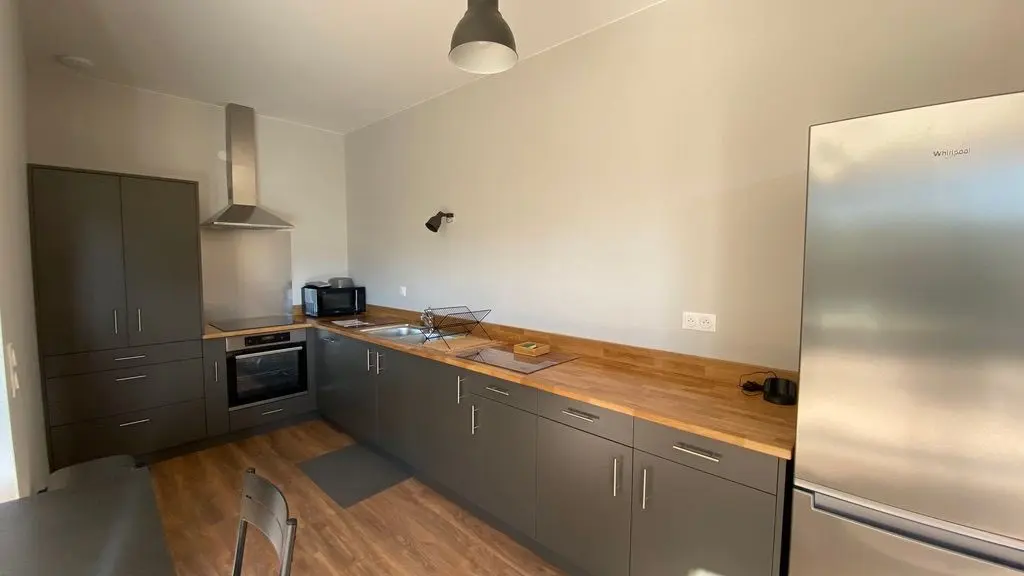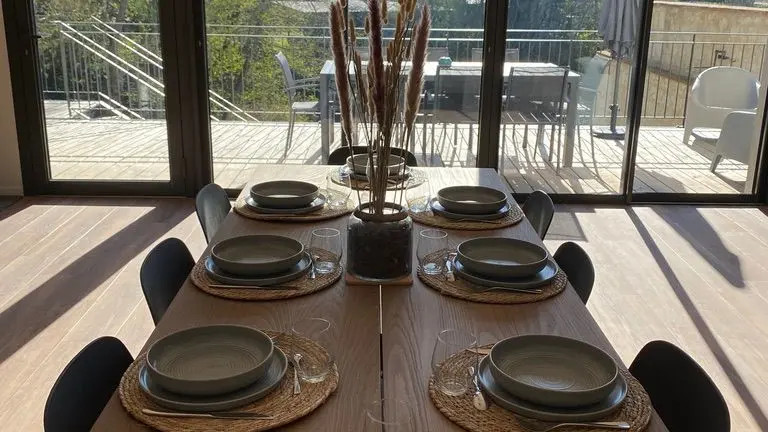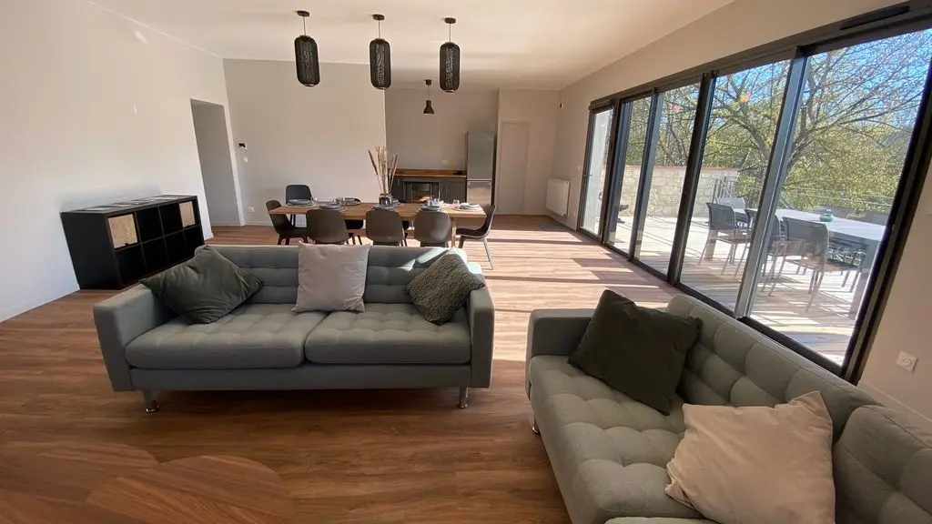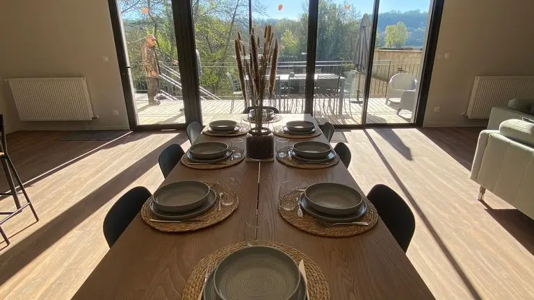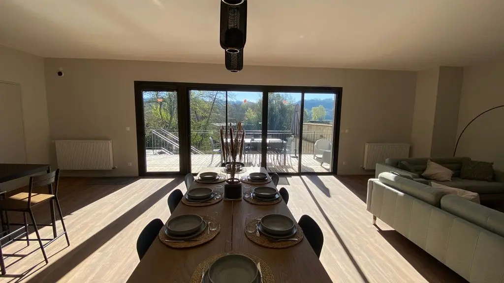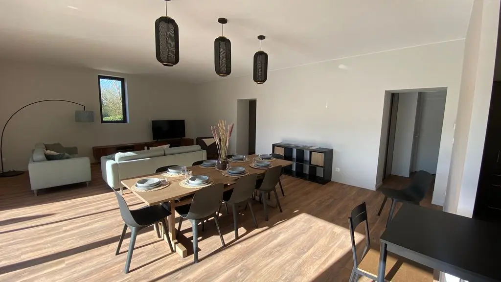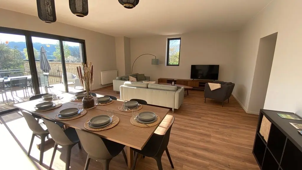 Ubicado en su totalidad en el primer piso, este alojamiento destaca por una encantadora sala de estar con grandes ventanales que se abren a una terraza espaciosa. La cocina, equipada con modernos electrodomésticos, se encuentra junto al comedor, donde una gran mesa y sillas invitan a disfrutar de agradables comidas. El salón es amplio y cómodo, con dos sofás de tres plazas, un sillón, una televisión y una mesa de centro.
