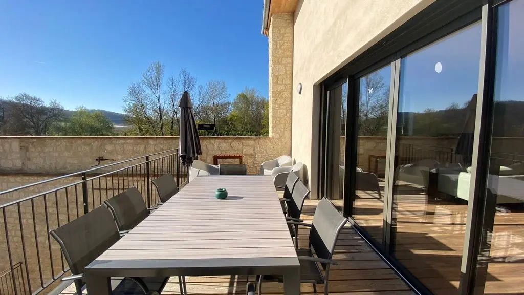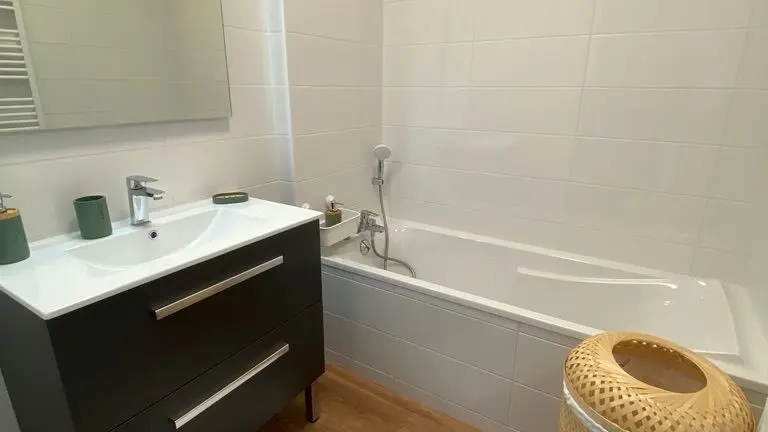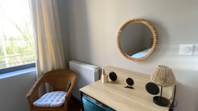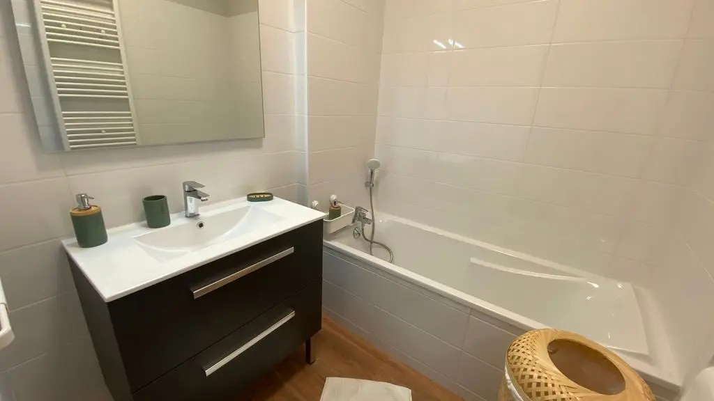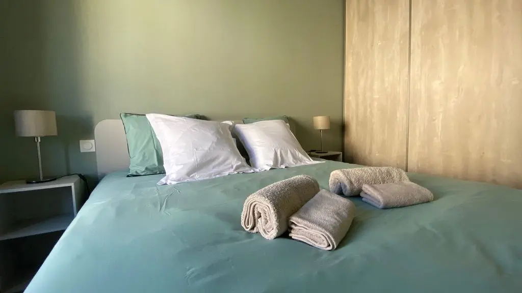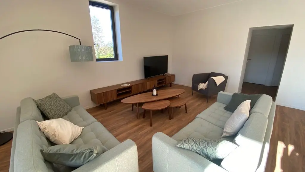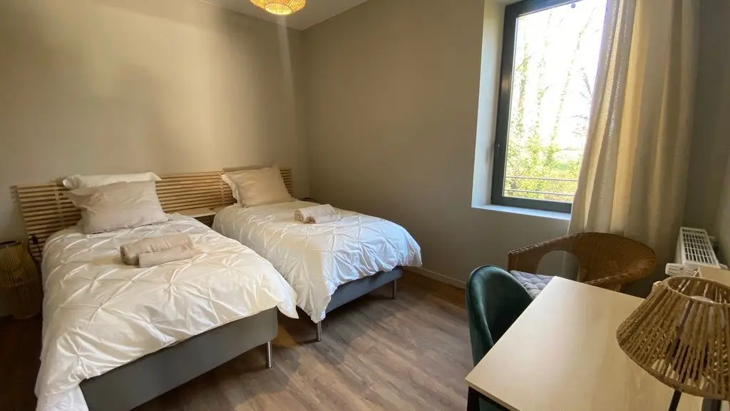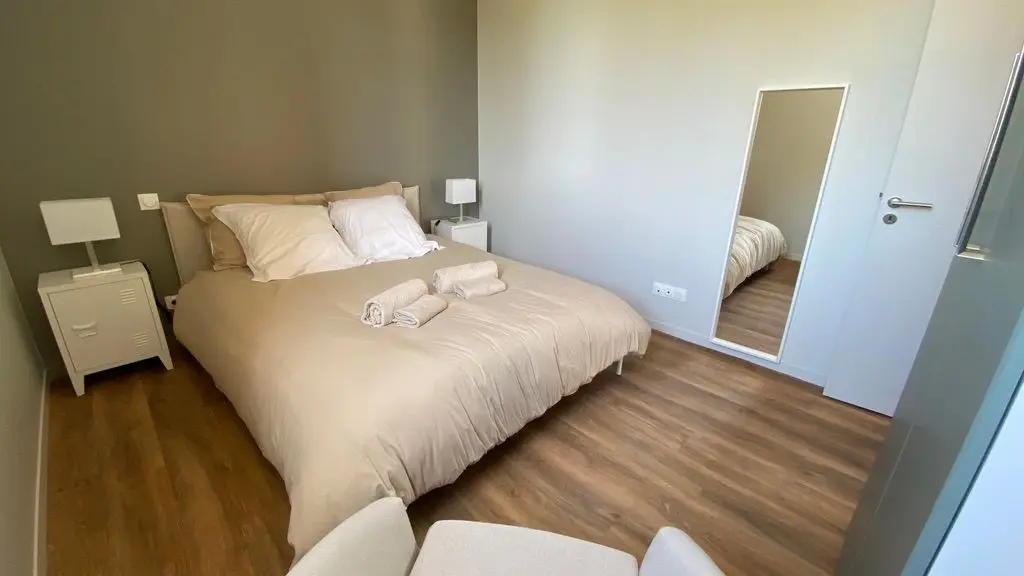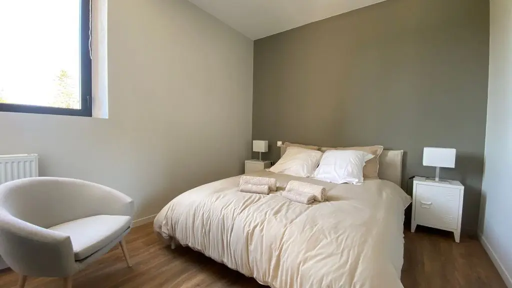 Ubicado en su totalidad en el primer piso, este alojamiento destaca por una encantadora sala de estar con grandes ventanales que se abren a una terraza espaciosa. La cocina, equipada con modernos electrodomésticos, se encuentra junto al comedor, donde una gran mesa y sillas invitan a disfrutar de agradables comidas. El salón es amplio y cómodo, con dos sofás de tres plazas, un sillón, una televisión y una mesa de centro.
