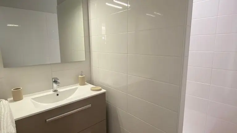 Este alojamiento cuenta con dos dormitorios, cada uno con dos camas individuales, además de un dormitorio principal con una cama matrimonial. También dispone de un cuarto de ducha, un baño completo y un aseo con lavabo. La gran terraza está amueblada con muebles de jardín, incluyendo mesa y sillas, tumbonas, una plancha y un parasol, creando un espacio ideal para relajarse.