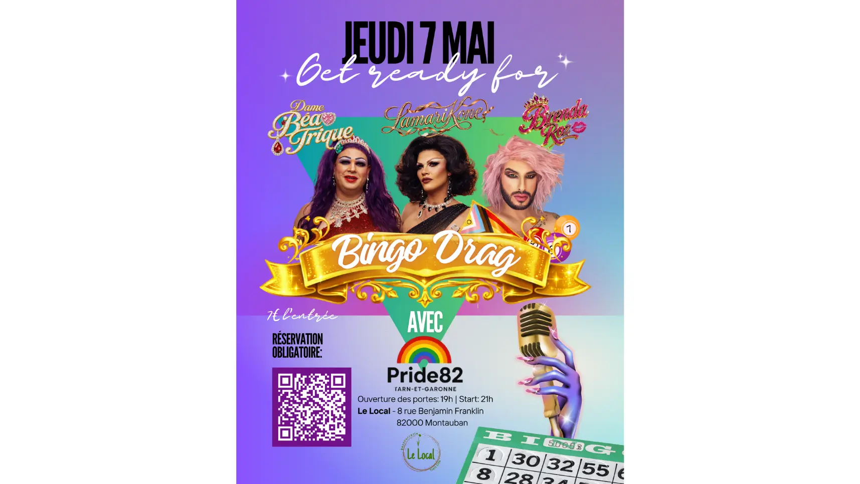 Una noche de bingo única, con espectáculos drag, humor, glamour y un ambiente electrizante. Toma asiento, prepara tu cartón y deja que las reinas se encarguen del resto: Dame Béatrique, Lamarikone y Brenda Roz.