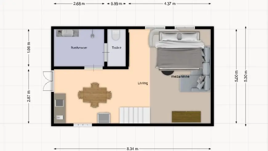 Este estudio se destaca por sus techos altos y su entrepiso con una cama doble, ofreciendo una gran sensación de espacio. Incluye una cocina práctica con refrigerador y un área de comedor. La sala de estar espaciosa bajo el entrepiso está equipada con televisión y un sofá convertible para 2 personas. Una ducha moderna y baños separados están integrados en un bloque sanitario bien diseñado. Sin duda, pasarás una estancia maravillosa y cómoda aquí.