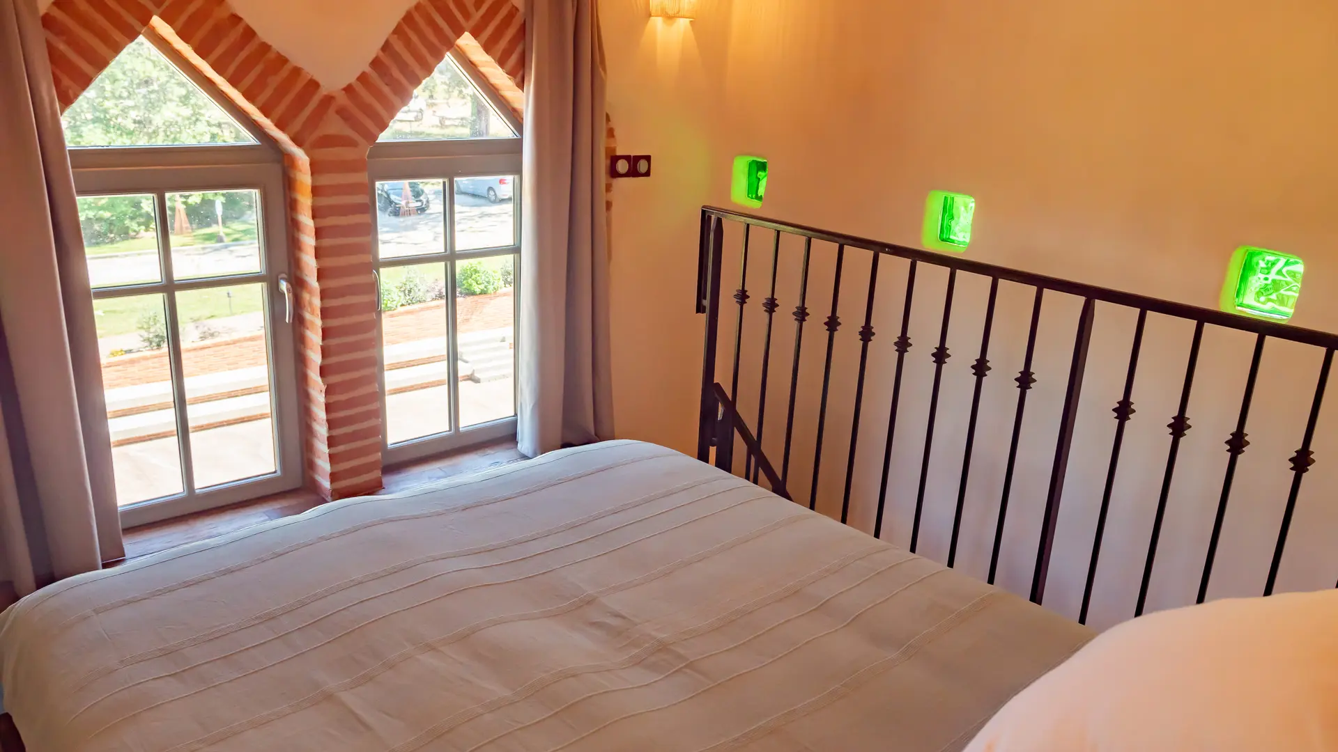Au deuxième niveau, une salle de bain avec toilettes séparées, offrant l'accès à la chambre située au quatrième et dernier niveau. Tarif : 420€/nuit, pour jusqu'à 8 personnes, séjour minimum de deux nuits.