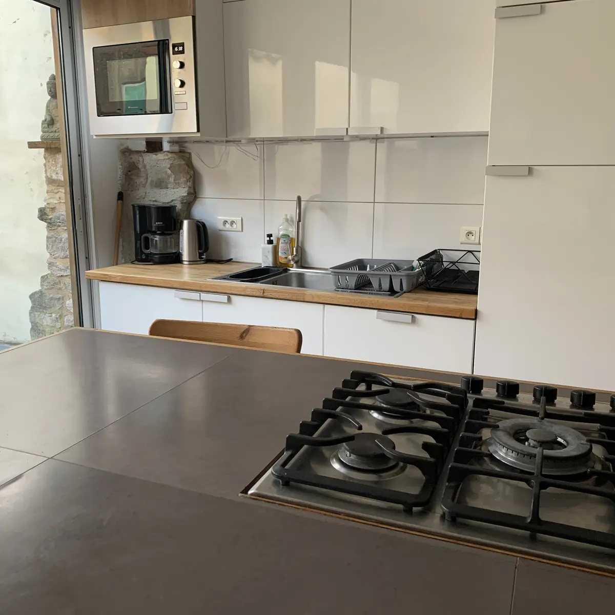 L'appartement, pour 4 personnes, se trouve au 2ème étage d'un petit immeuble comprenant l'habitation du propriétaire au 1er étage. L'accès par escalier vous amène sur un palier où se trouve la porte l'entrée du logement qui comprend : un séjour (33 m2) avec canapé, TV, poêle à granulés, une table de salle à manger. La cuisine (combiné four / micro-ondes lave-vaisselle, réfrigérateur-congélateur), se trouve en mezzanine avec accès direct sur un patio privé (salon de jardin, grill électrique). 1 chambre ( 1 lit 180, moquette), 1 chambre (2 lits 90 jumelables, moquette), 1 salle d'eau et 1 WC indépendant.