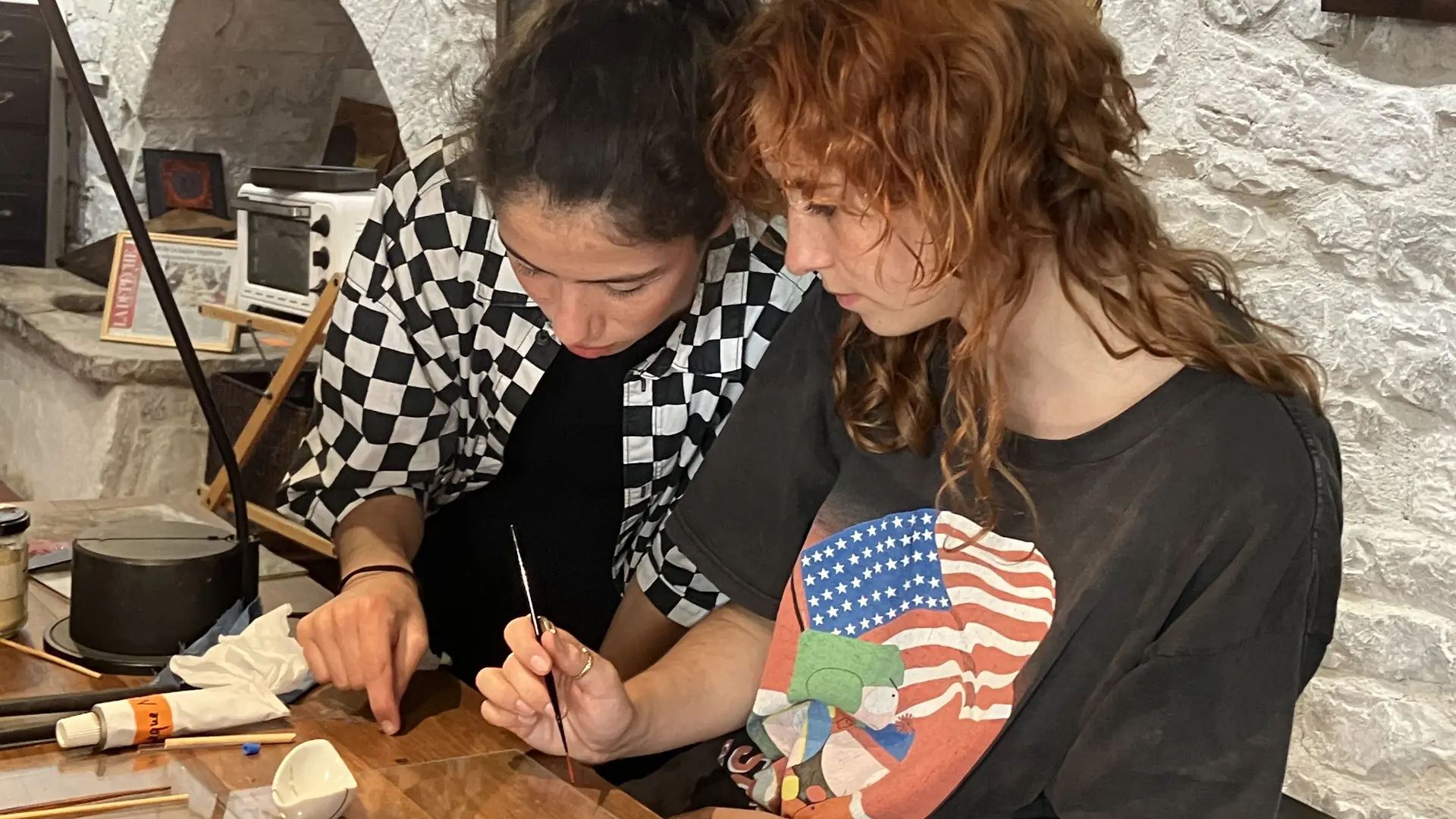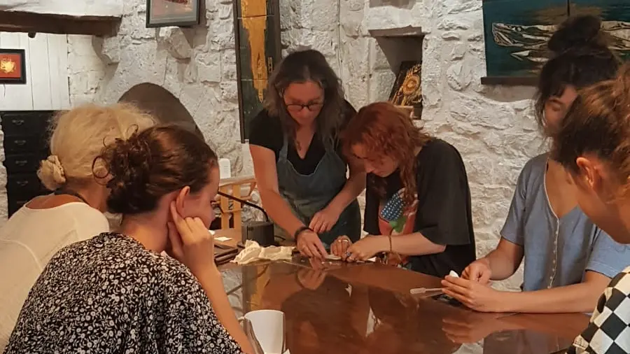 Vous appliquerez ensuite les couches de différentes couleurs de recouvrement, avant de révéler votre tableau grâce au ponçage. Les journées du stage sont dense mais la journée de séchage permet de se relaxer dans le village médiéval de St-Antonin-Noble-Val.