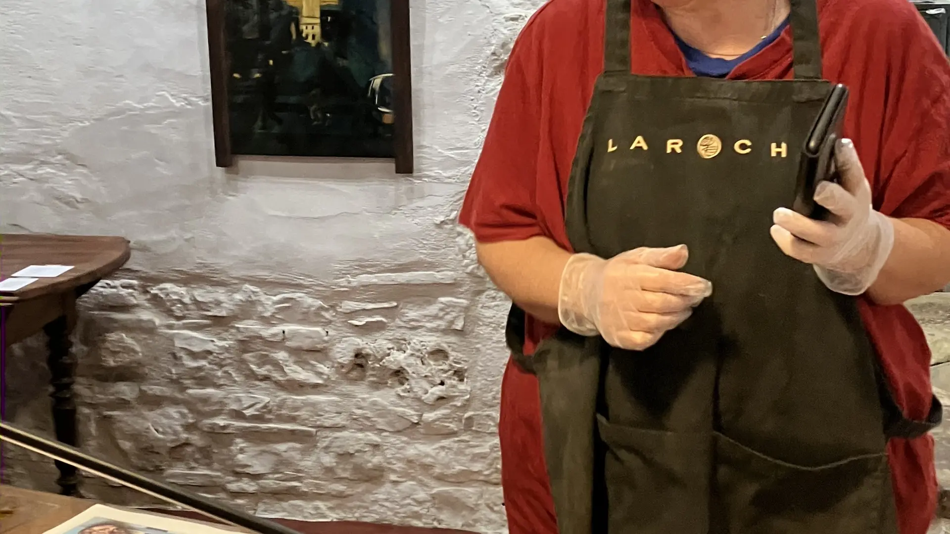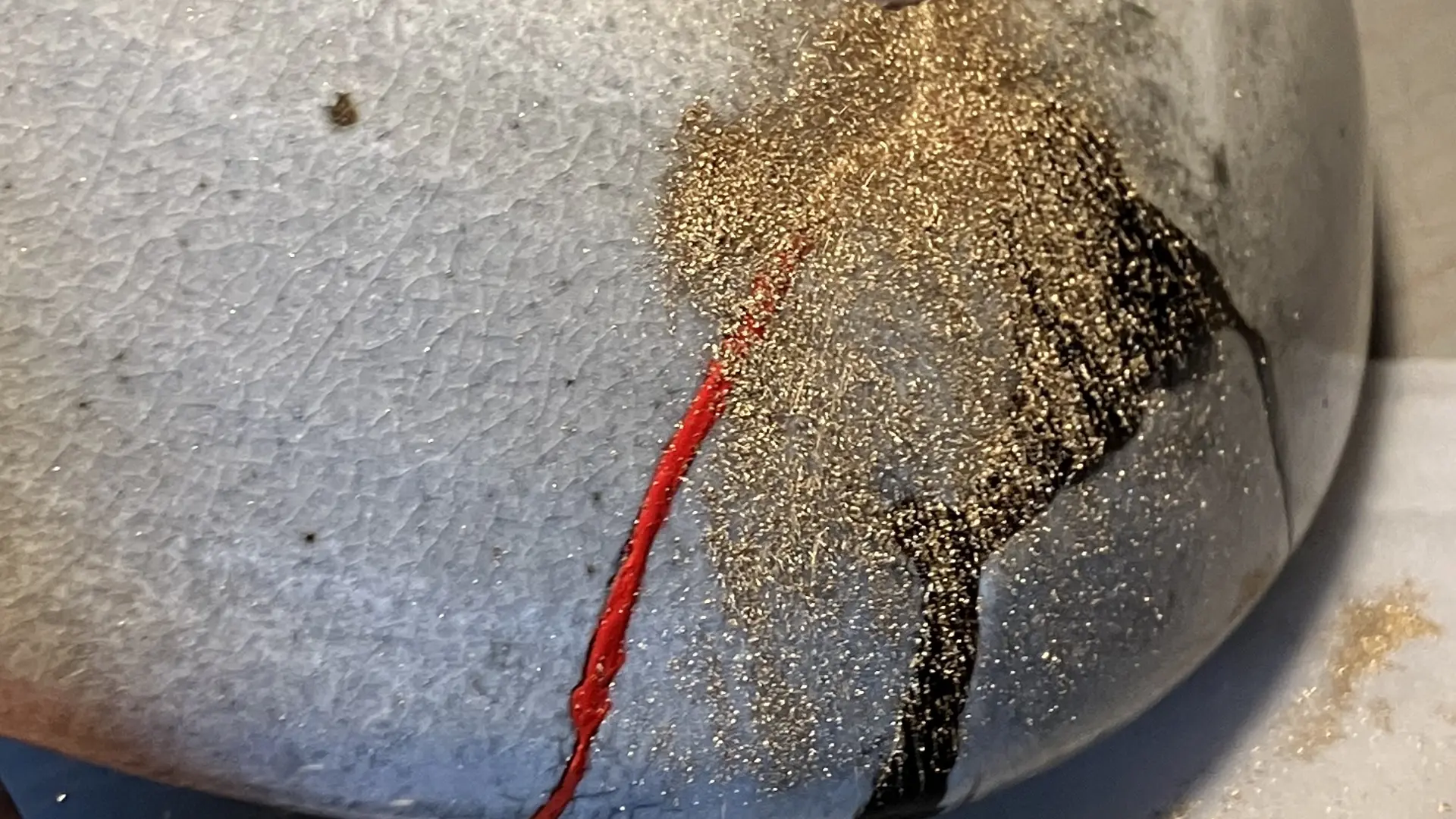 Le 2e jour, ponçage des mastics d’argile pour appliquer la laque noire. La dorure est réalisée l’après-midi. Organisation du paquetage pour le transport.