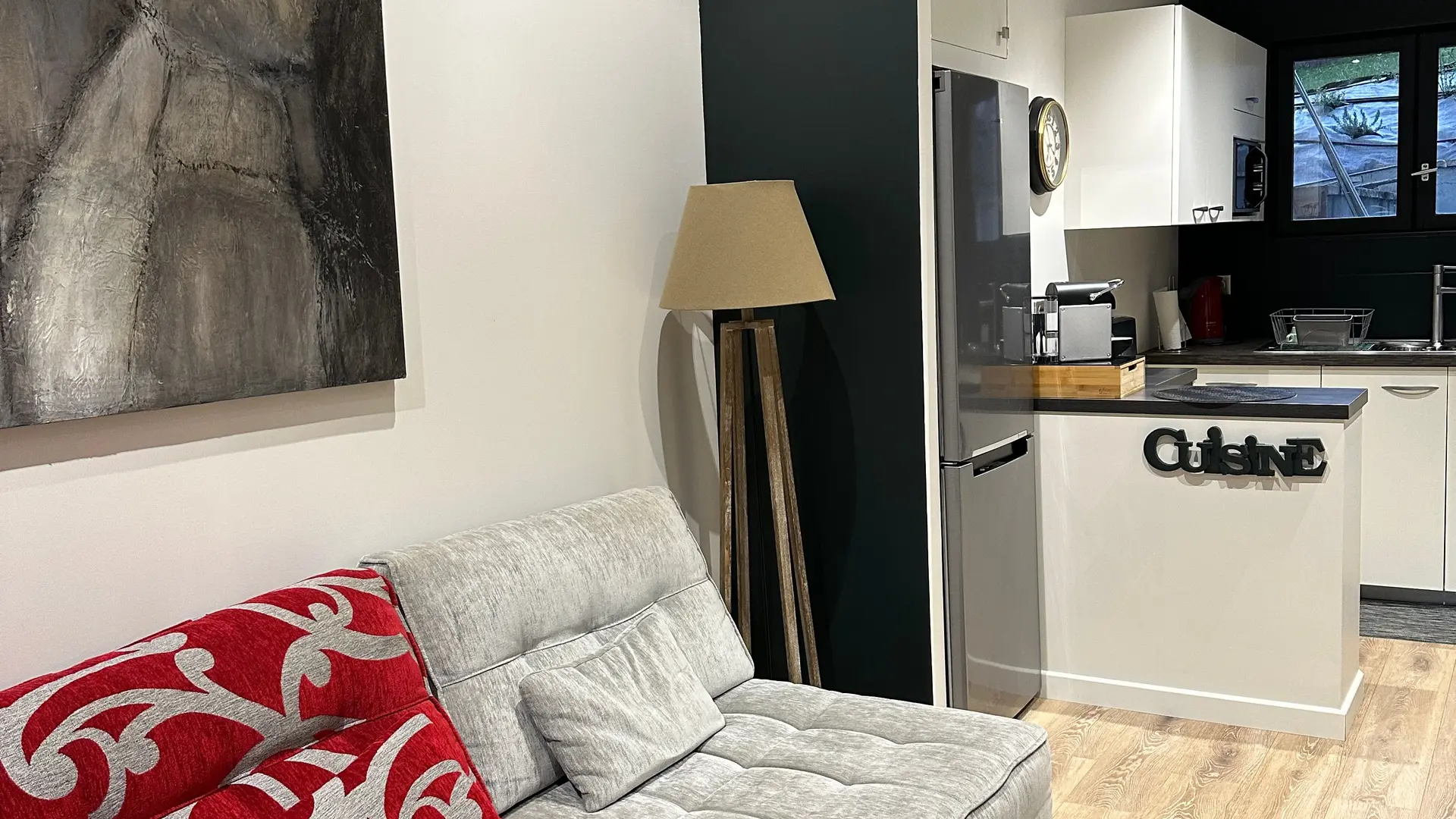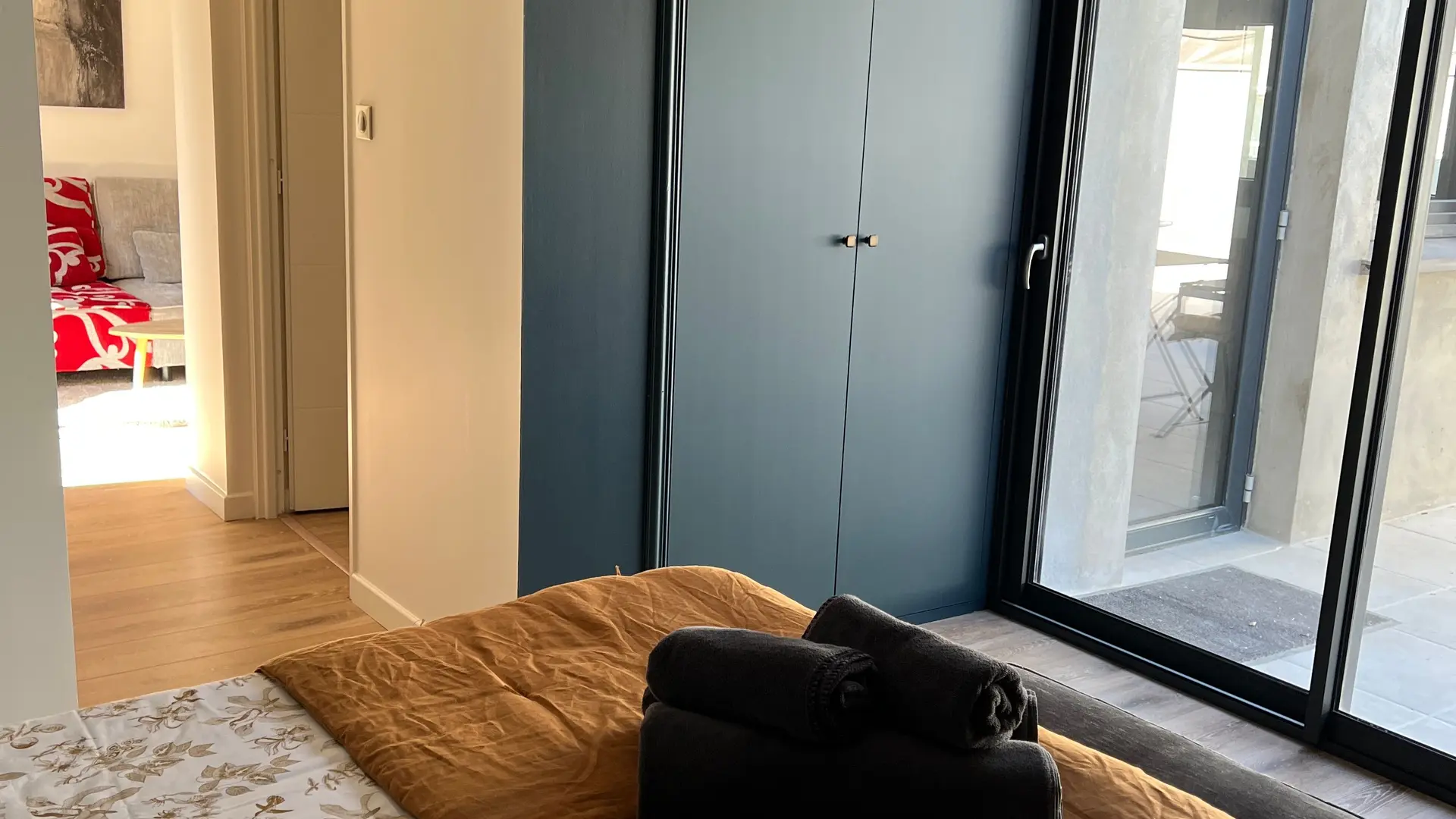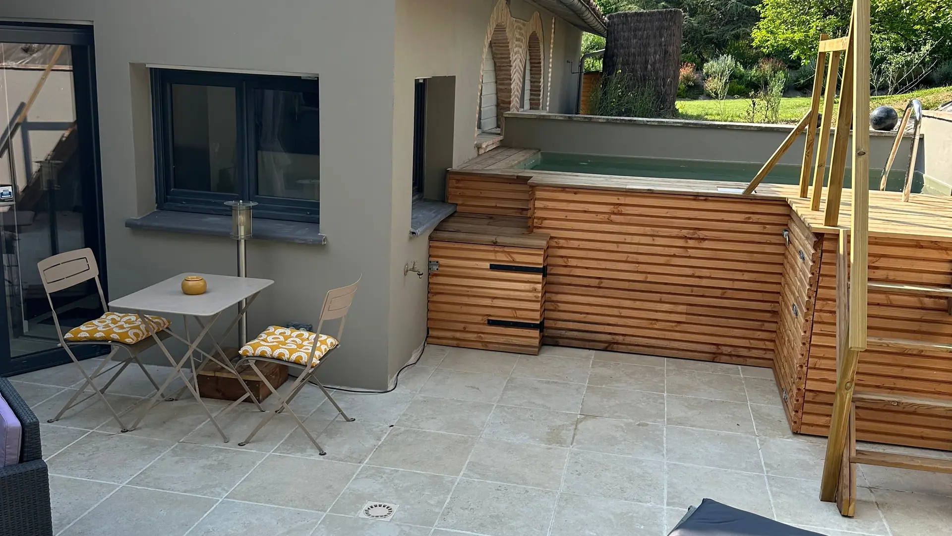 Logement de plain-pied avec entrée indépendante. Il comprend : 1 séjour avec coin-cuisine (éléments intégrés, micro-ondes) et salon (canapé, TV), 1 cellier (lave-linge, réfrigérateur-congélateur), 1 chambre (1 lit 160/190) avec salle d'eau communicante, 1 wc , indépendant. WIFI dans le logement compris dans le prix, linge de lit de toilette et de maison fournis compris dans le prix. Terrasse privée (45m2) où se trouve une piscine privée. Salon de jardin, barbecue. Parking privé. 2 vélos VTC sur place. Chauffage électrique.et climatisation