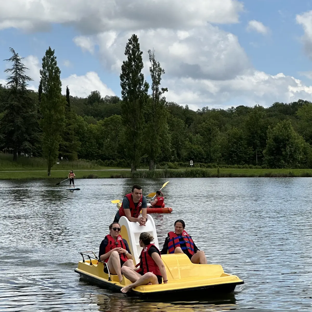 Que vous préfériez pagayer au rythme des vagues en canoë, explorer en paddle, ou glisser sur l’eau en pédalo, chaque instant passé sur le Lac de Parisot est une promesse de paix et d’évasion.